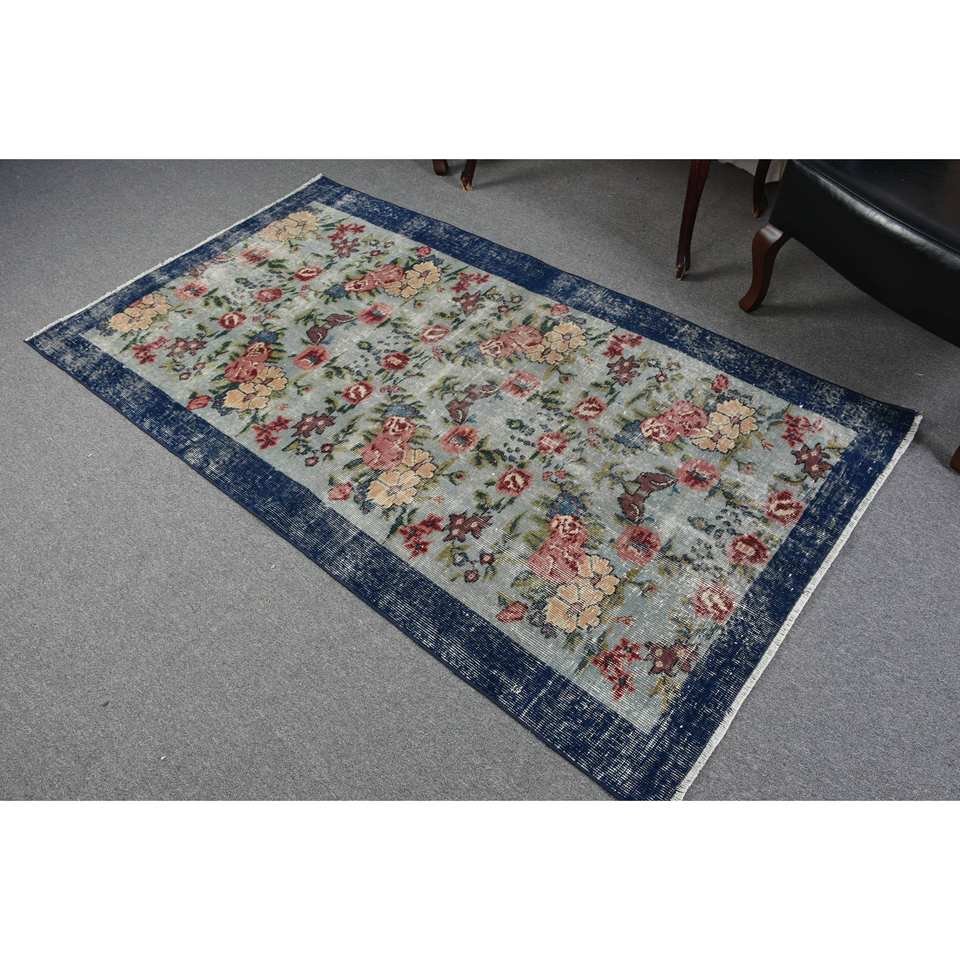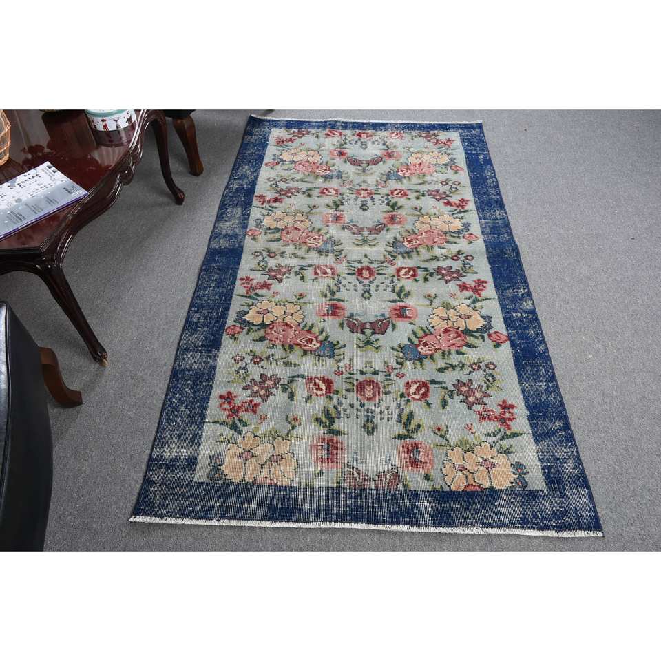 พรมขนสัตว์สีเบจสีน้ำเงินคลาสสิกขนาด3.7x6.5ฟุตงานเย็บปะสไตล์ตุรกีสำหรับห้องนั่งเล่นหรือห้องนอนพร้อมแผ่นยางรองหลัง
