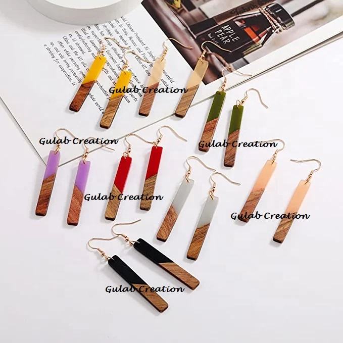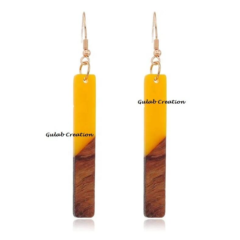 ต่างหูทรงเรขาคณิตสไตล์โบโฮคลาสสิกสำหรับผู้หญิงต่างหูเรซินเหลืองไม้ยาวสองสีห้อย