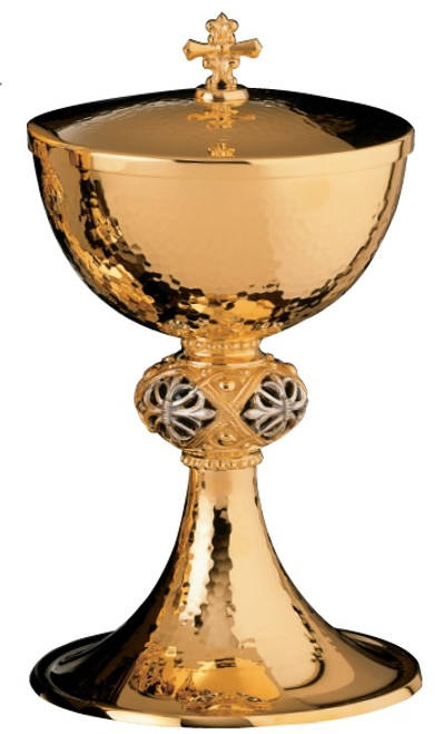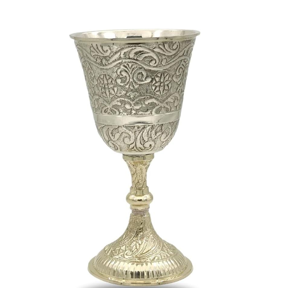 ซิโบเรียมทองเหลืองคลาสสิกมีการออกแบบกราฟและใบไม้แกะสลักอยู่ใต้ปากชามพร้อมการชุบทอง 24 กะรัตภายในถ้วย