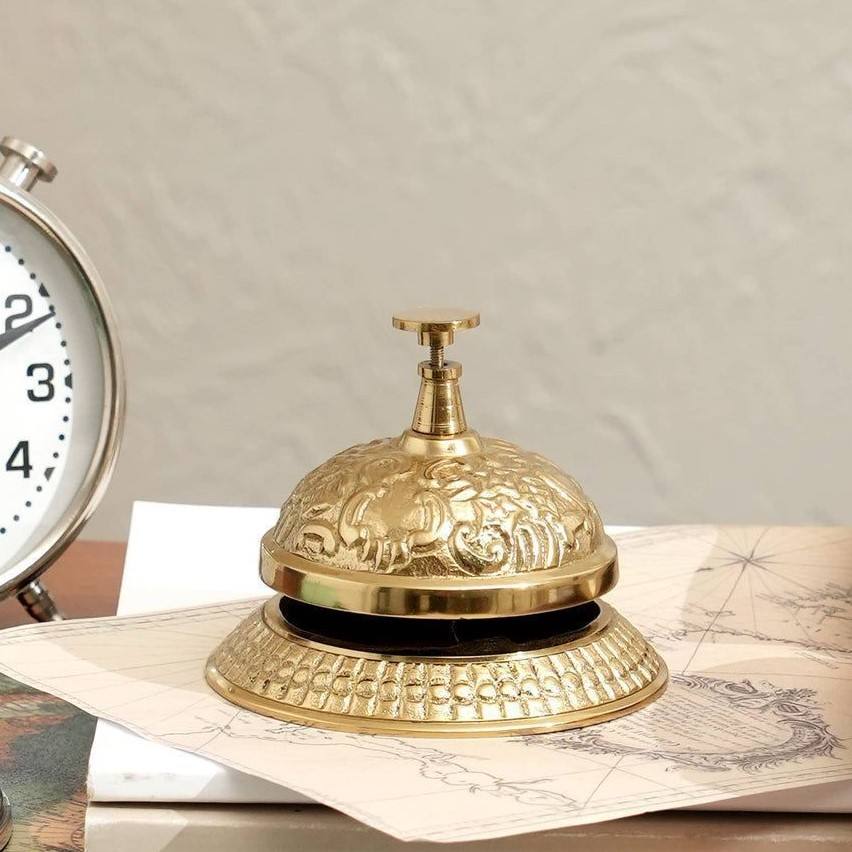 กระดิ่งตั้งโต๊ะทองเหลืองแบบคลาสสิก พร้อมการตกแต่งสไตล์โบราณ เสียงดังชัดเจน เหมาะสำหรับใช้ในโรงแรม แผนกต้อนรับ สำนักงาน หรือโต๊ะทำงาน