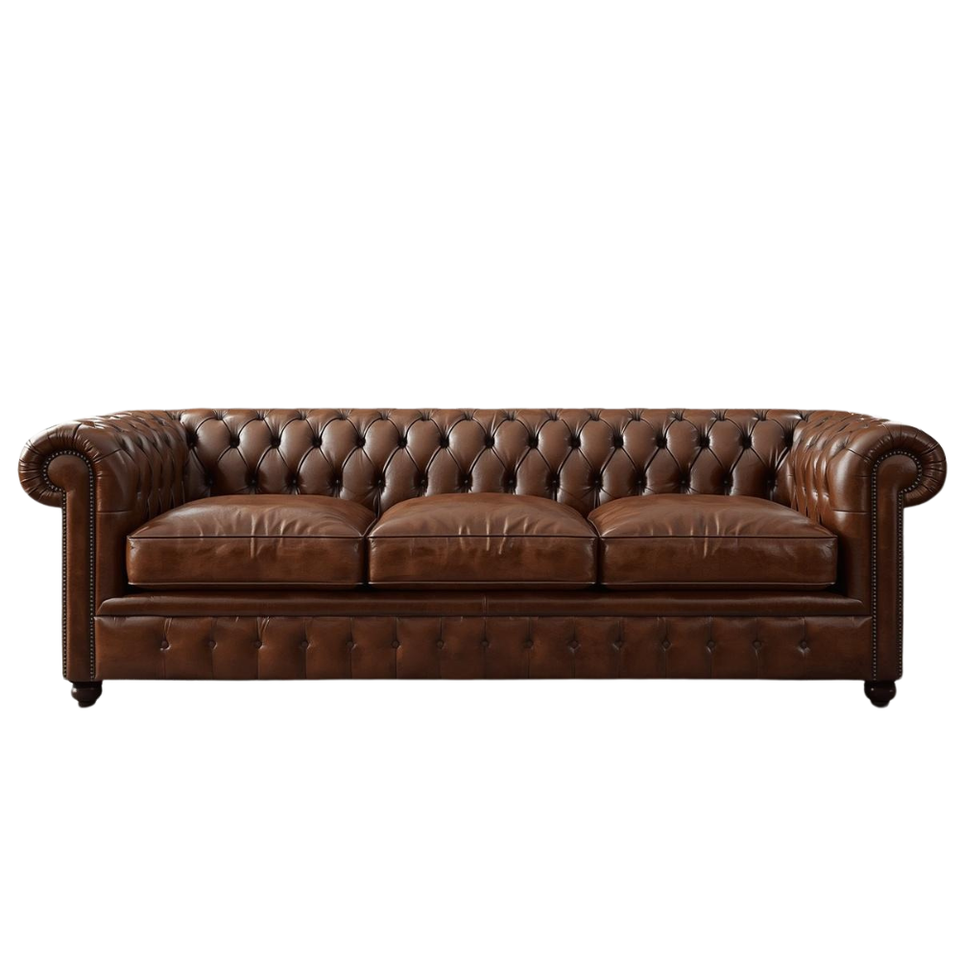 โซฟาเชสเตอร์ฟิลด์หนังสีน้ำตาลคลาสสิก 3 ที่นั่ง พนักพิงแบบทัฟท์ลึก ตกแต่งด้วยหมุดโลหะ โซฟาหรูหราสำหรับห้องนั่งเล่น สำนักงาน โรงแรม