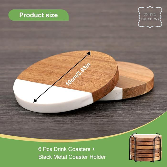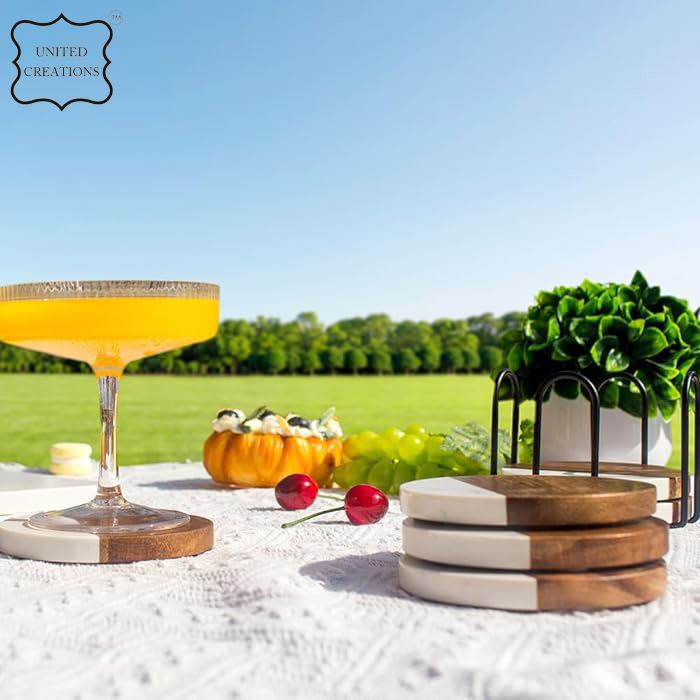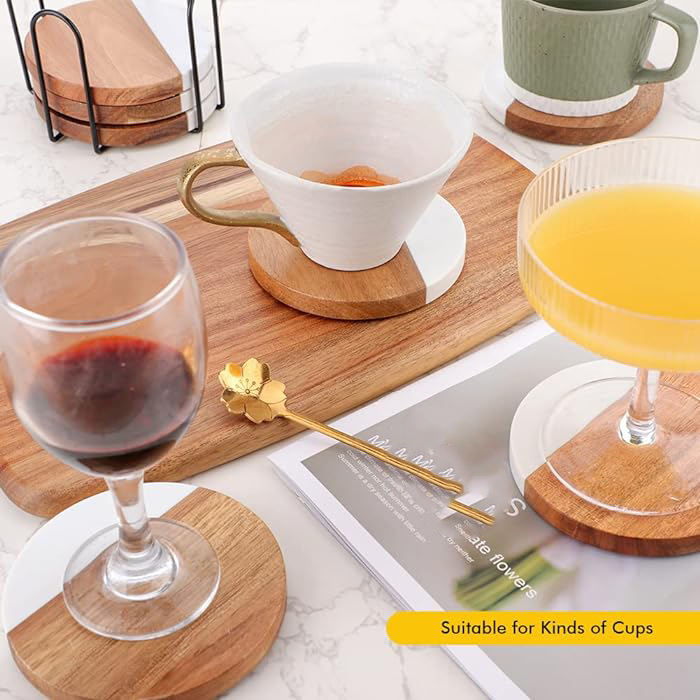 ที่รองแก้วเซรามิกคลาสสิกที่มีแผ่นรองลายไม้และหินหินอ่อนสำหรับเครื่องดื่ม