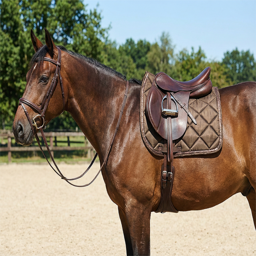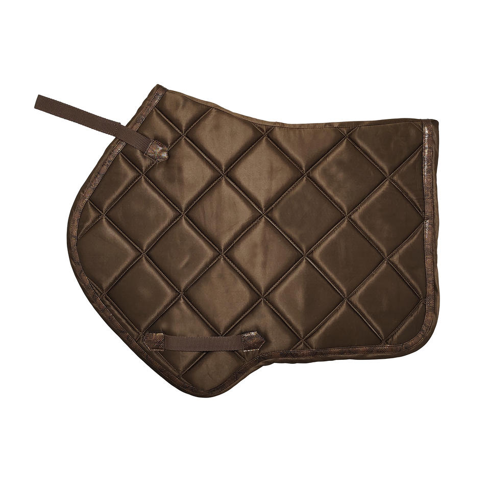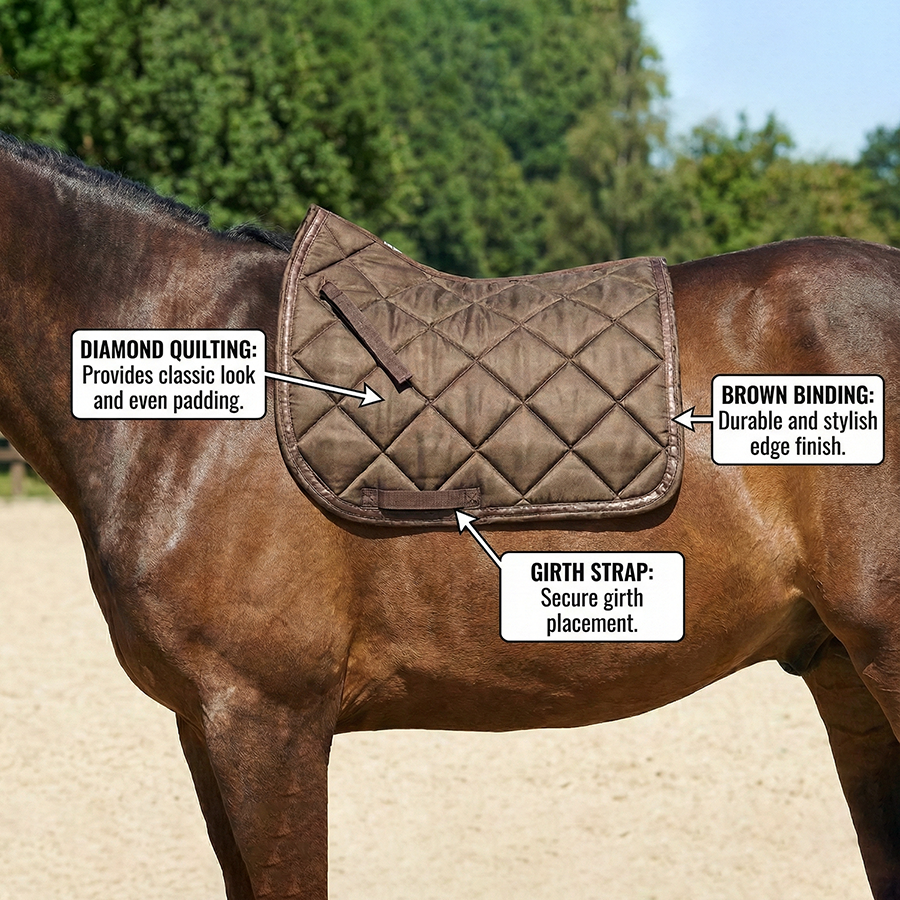 แผ่นรองอานม้าแบบคลาสสิกสีน้ำตาลช็อกโกแลต ทำจากผ้าฝ้าย รูปทรงสูงพิเศษ พร้อมสายรัดอานแบบโค้งมน บุด้วยโฟมแบบช่อง