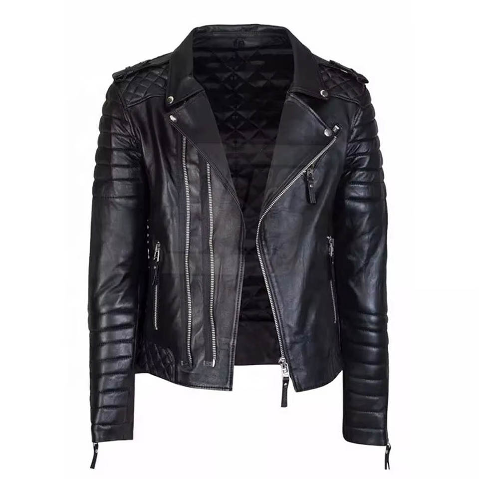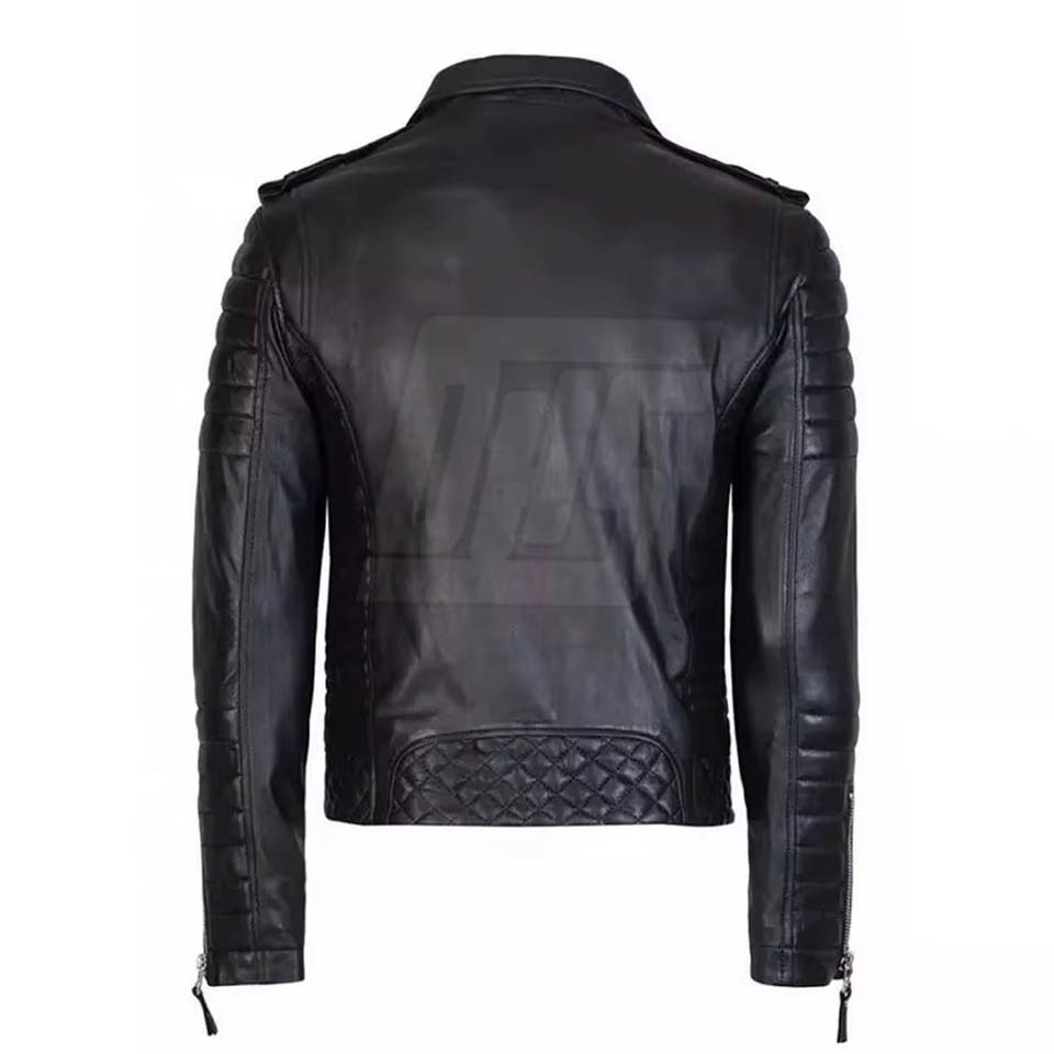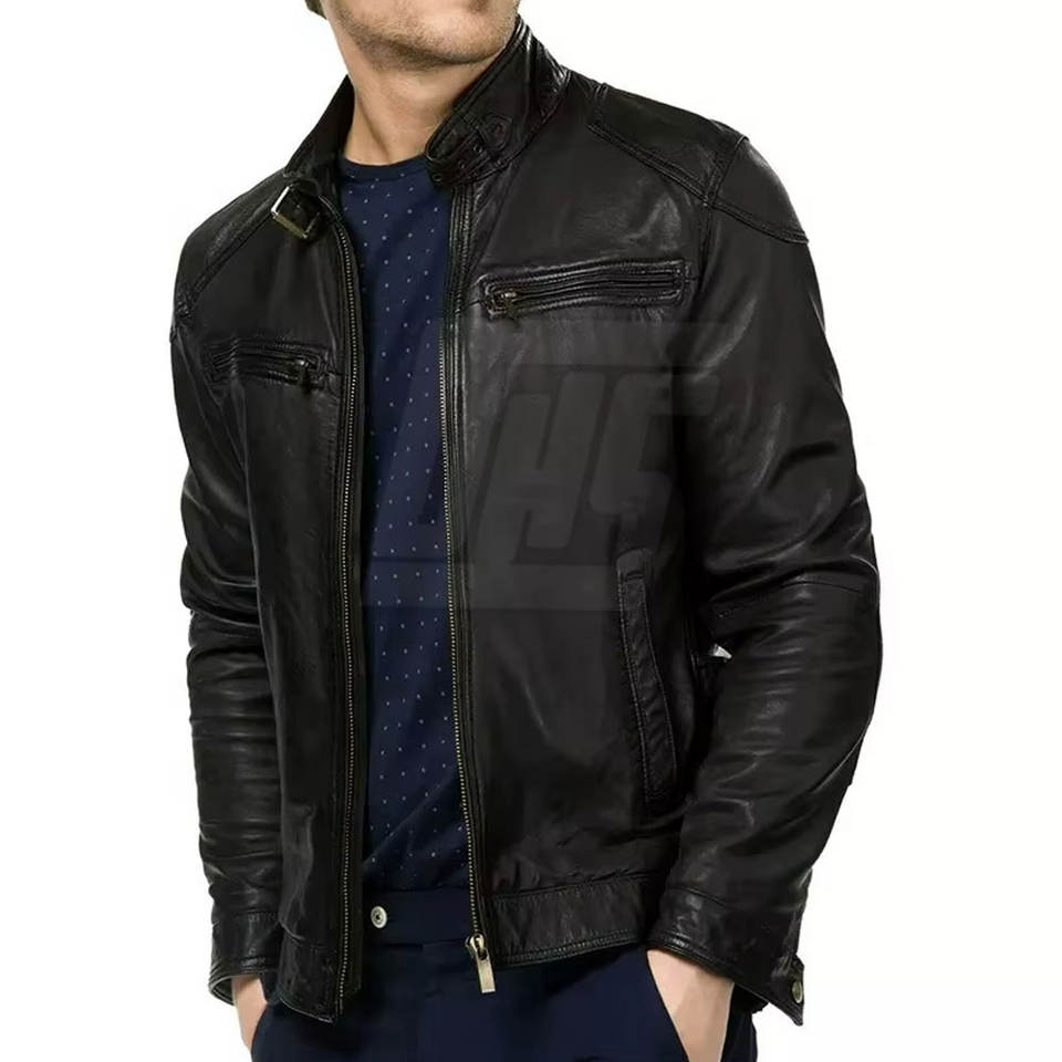 แจ็กเก็ตหนังของผู้ชายดีไซน์เข้ารูปแจ็กเก็ตฤดูหนาวเย็บทนทานแบบคลาสสิกสำหรับผู้ชาย