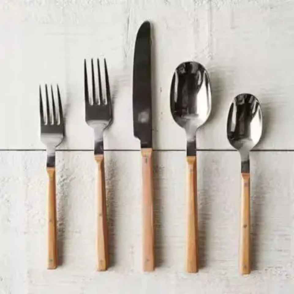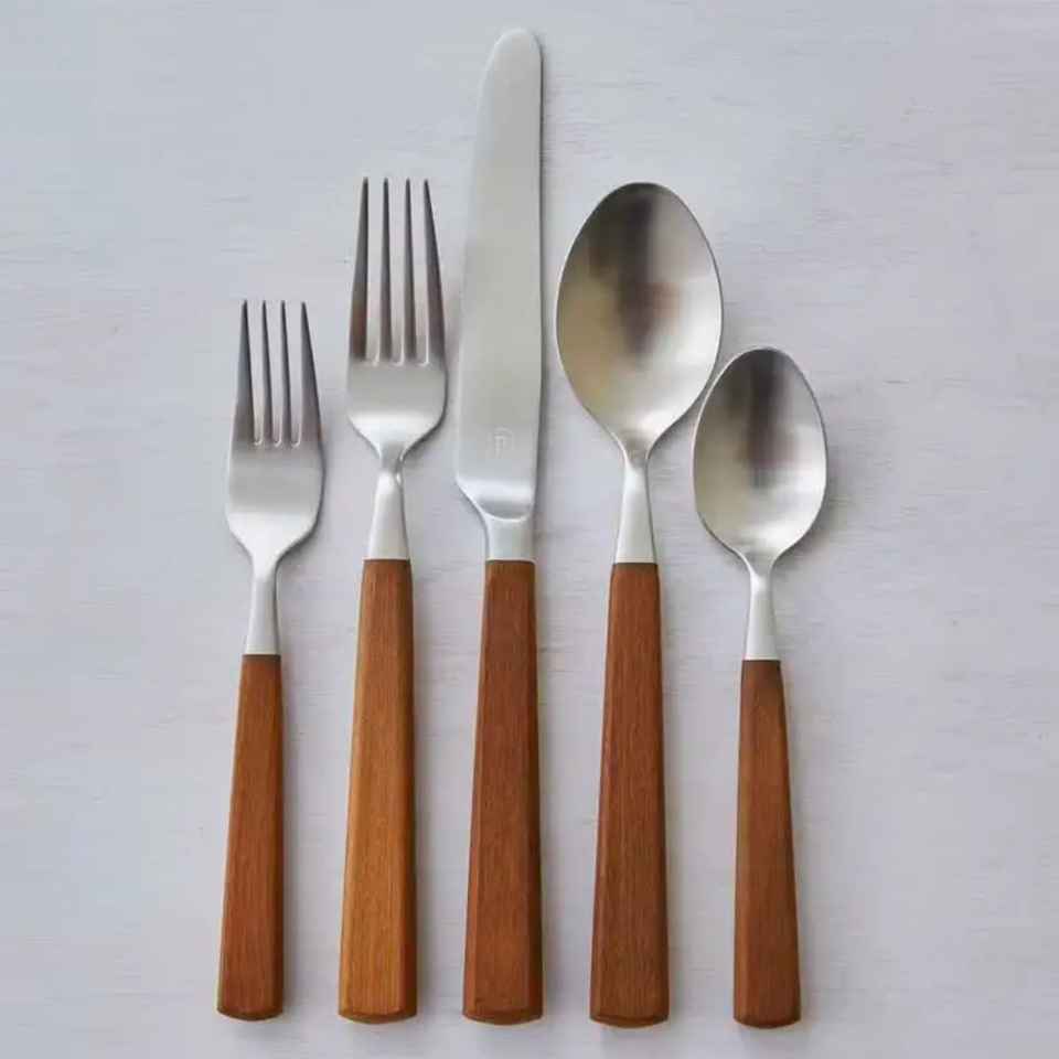 ชุดช้อนส้อมสแตนเลสแบบคลาสสิก พร้อมด้ามไม้ ชุดช้อนส้อมโลหะสีเงิน ขัดเงา ทนทาน เหมาะสำหรับงานแต่งงาน