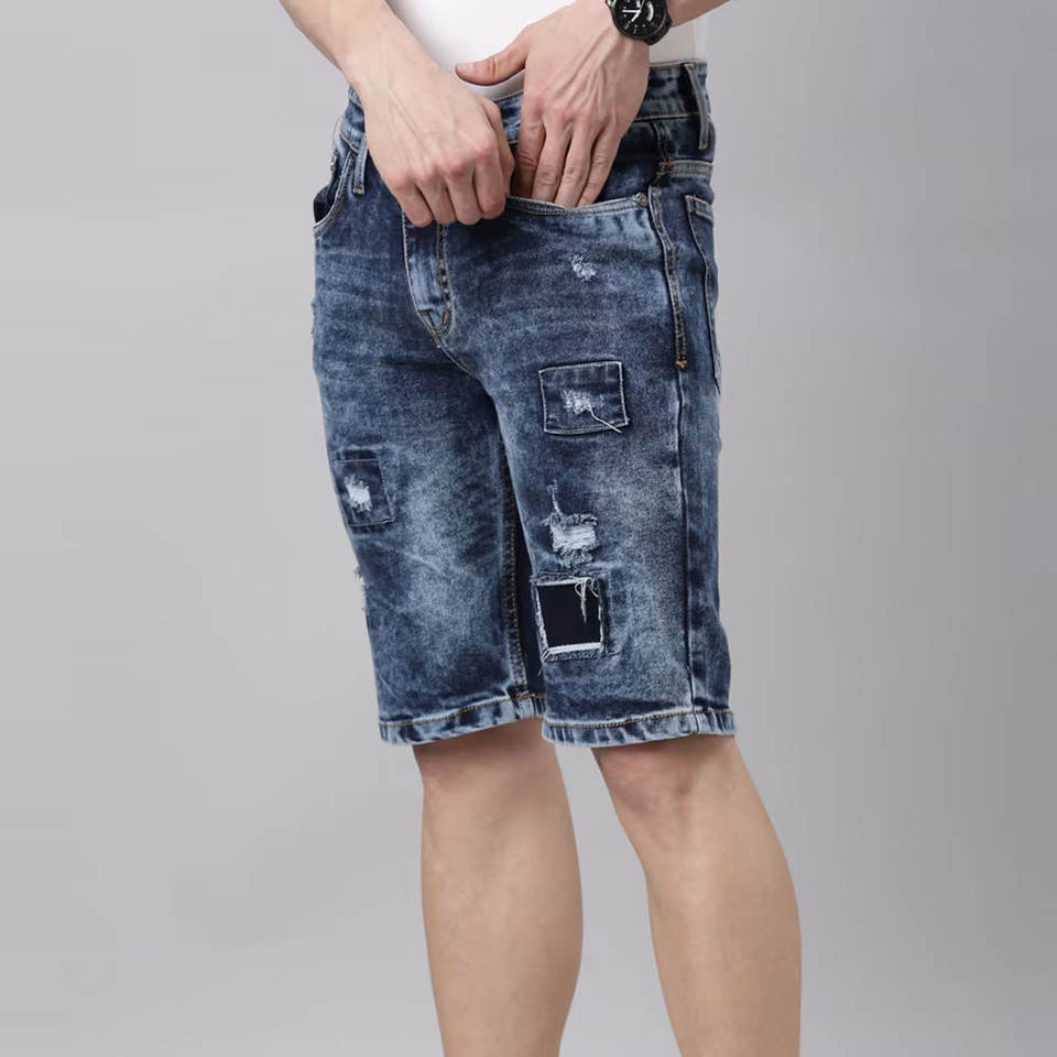 กางเกงยีนส์ขาสั้นผู้ชายสีน้ำเงินเข้มสไตล์ลำลองสำหรับฤดูร้อน ผ้าฝ้าย 100% เอวสูง ซิปหน้า ทรงสลิมทันสมัย สไตล์สตรีท