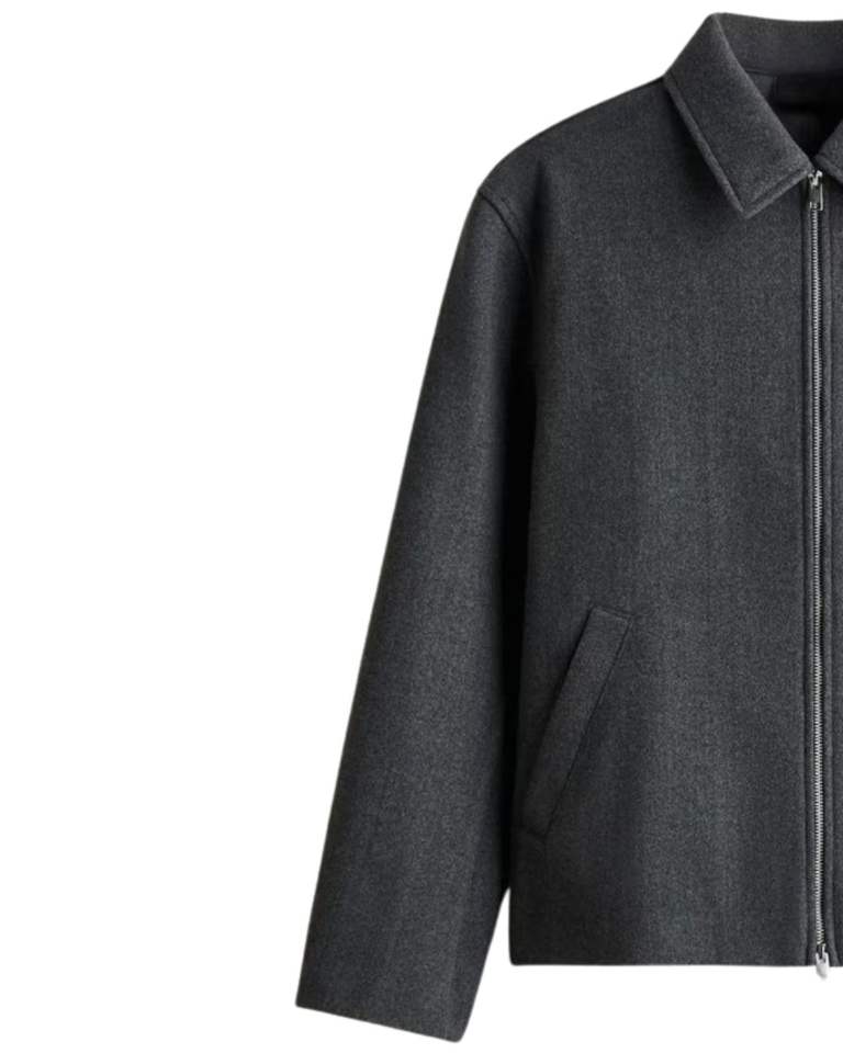 เสื้อแจ็คเก็ตขนสัตว์สีเทาเข้มคลาสสิกสำหรับผู้ชาย มีปกแหลมและกระเป๋าข้าง เสื้อคลุมกันหนาวแบบมินิมอลสีชาร์โคล