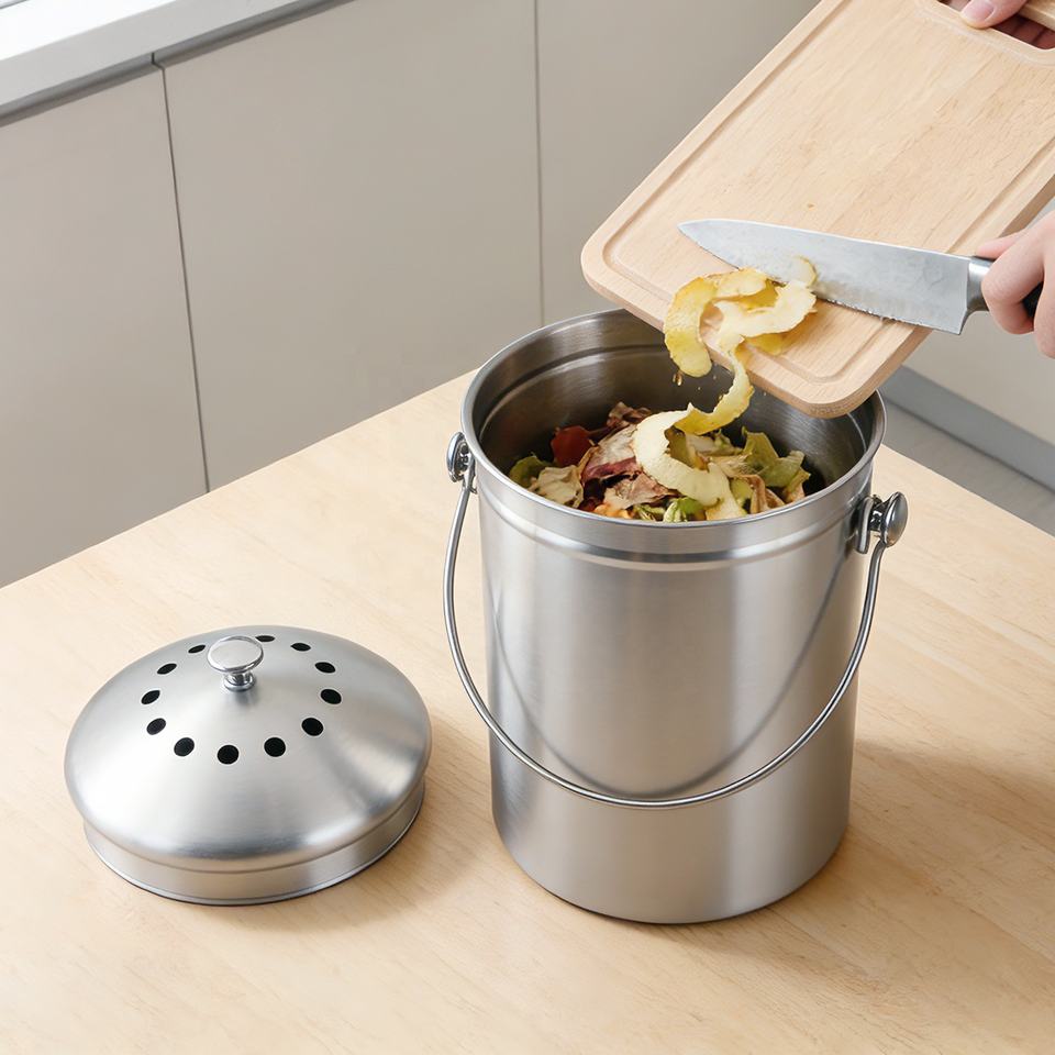 ดีไซน์คลาสสิก ความจุ 1.3 แกลลอน ทำความสะอาดง่าย ไม่มีกลิ่น สำหรับทำปุ๋ยหมัก พร้อมไส้กรองถ่านและฝาปิด
