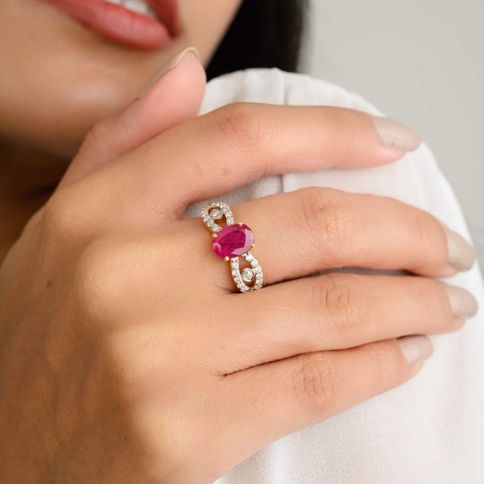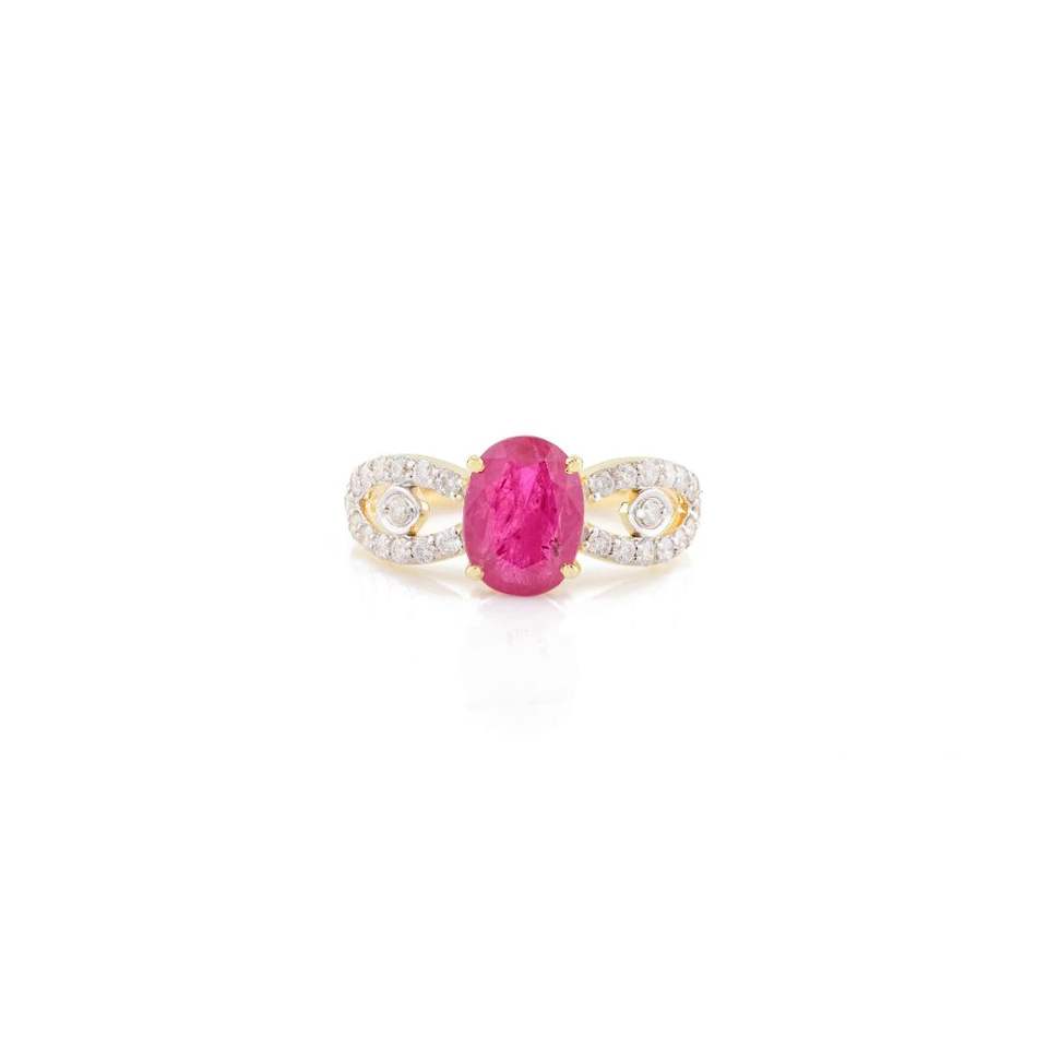 แหวนแต่งงานเพชรและทับทิมทรงวงรีธรรมชาติดีไซน์แบบคลาสสิกดีไซน์จากนักออกแบบในทองคำ14K แข็งสีเหลืองขายส่งเครื่องประดับชั้นดี