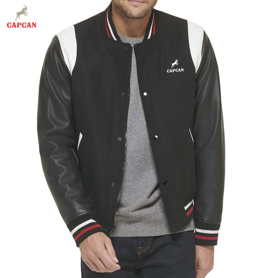 แจ็คเก็ตวาร์ซิตี้ดีไซน์คลาสสิก งานพรีเมียม แขนหนังแท้ ตัวเสื้อทำจากผ้าขนสัตว์ คอตั้ง แจ็คเก็ตฤดูหนาวที่เป็นมิตรกับสิ่งแวดล้อม