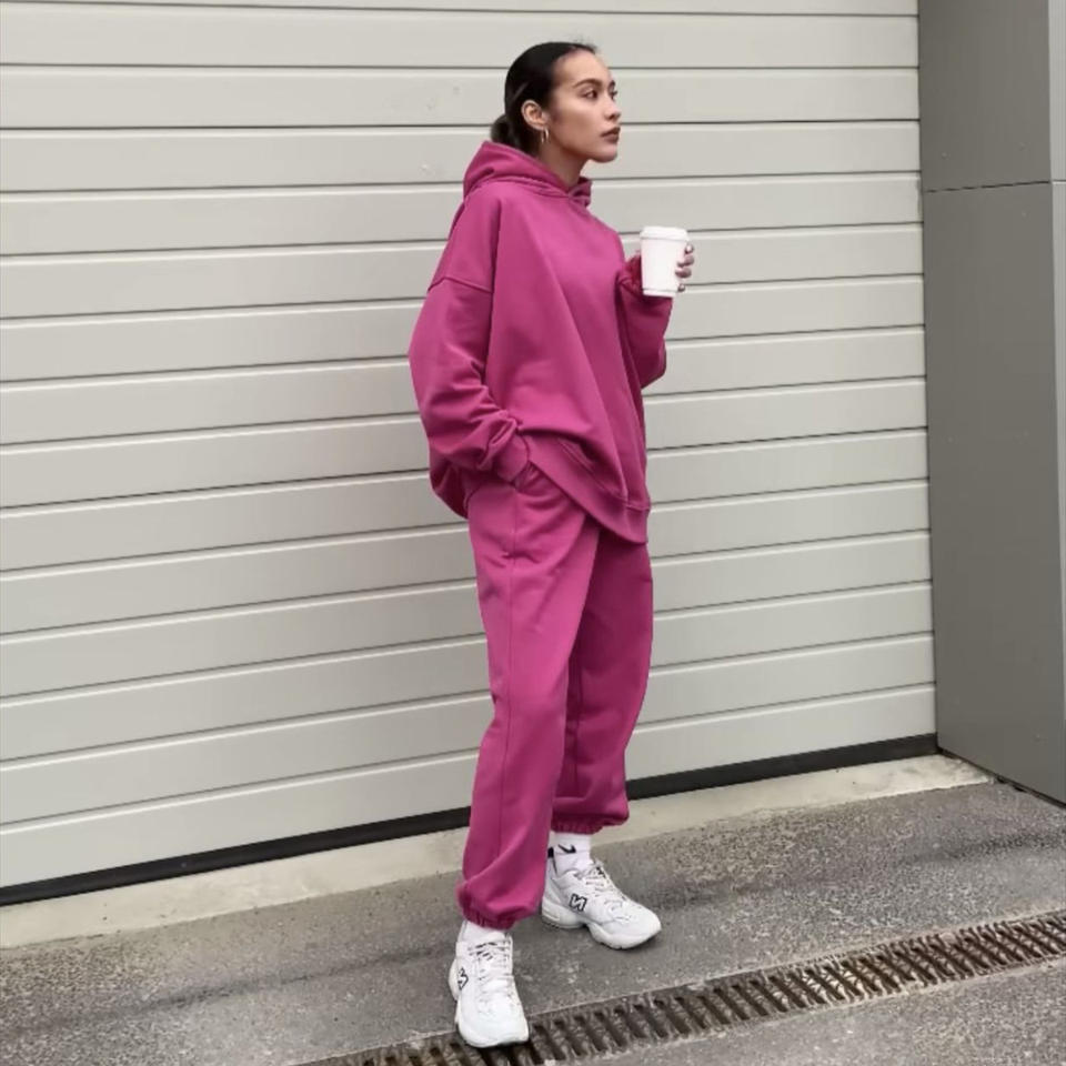 ชุดเสื้อผ้า2ชิ้นแบบคลาสสิกไหล่ปล่อยแบบคลาสสิกผ้าฝ้ายแบบพรีเมี่ยมกางเกงสเวตเตอร์มีฮู้ดขนาดใหญ่มีรูปแบบสีทึบราคาถูก