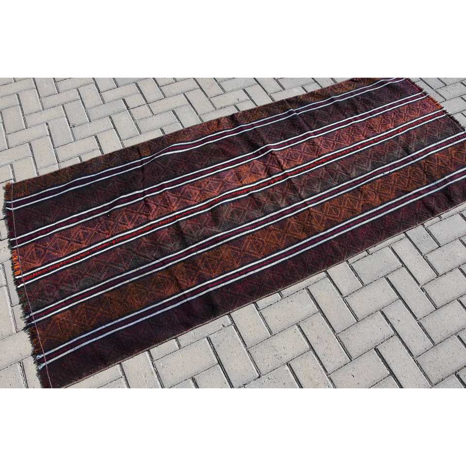 พรมขนสัตว์คลาสสิกลายทางสีน้ำตาลและสีแดงขนาด3.1x7.1ฟุตสี่เหลี่ยมผืนผ้าสำหรับห้องนั่งเล่นหรือห้องโถงพื้นหลังเป็นยางหนา10มม.