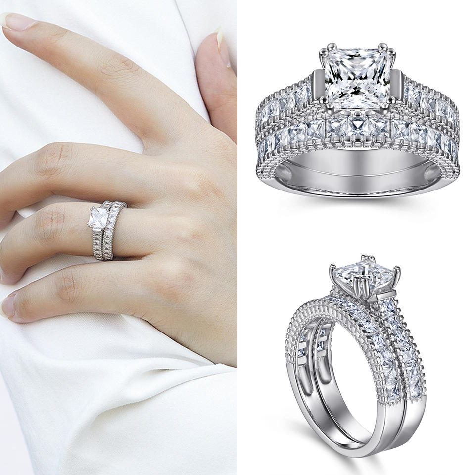 ชุดสร้อยคอต่างหูแหวนเพทายสี่เหลี่ยมสไตล์ยุโรป S925ผู้หญิงคลาสสิกชุดสามชิ้นสำหรับเงินสเตอร์ลิง