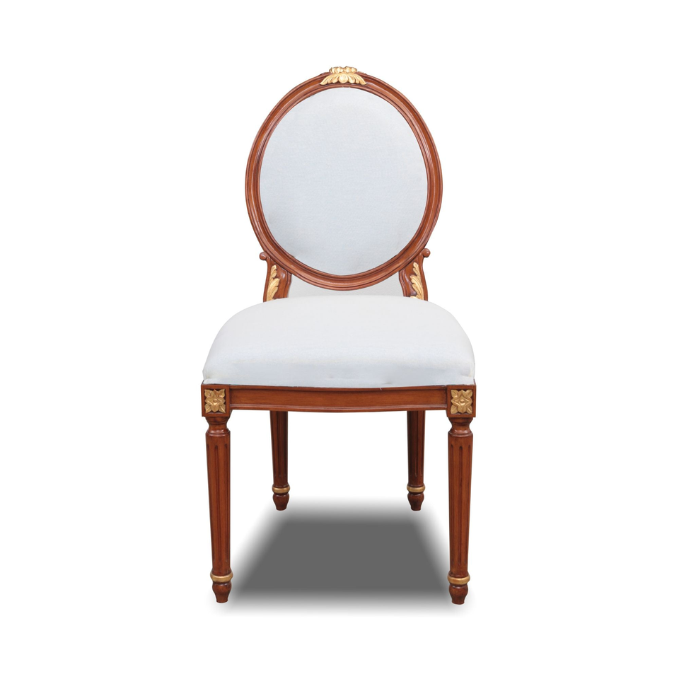 เก้าอี้รับประทานอาหารสไตล์ยุโรปคลาสสิกด้านหลังทรงวงรีพร้อมสำเนียงแกะสลักสีทองเก้าอี้โรงแรมสุดหรูจากญี่ปุ่น