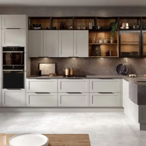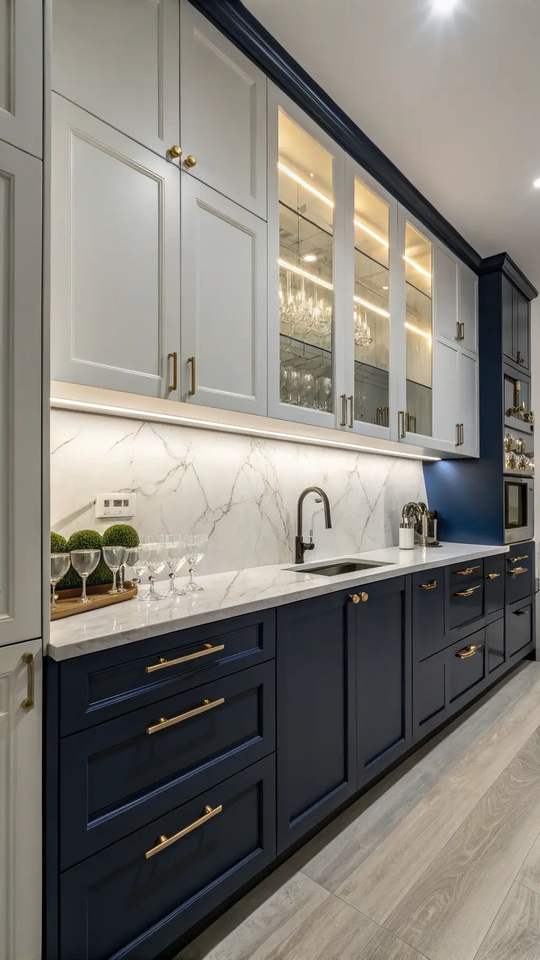 ครัวสไตล์ยุโรปแบบโมดูลาร์สุดคลาสสิก พร้อมตู้สีน้ำเงินหรูหรา ระบบจัดเก็บอัจฉริยะ และงานตกแต่งระดับพรีเมียมสำหรับบ้านสมัยใหม่