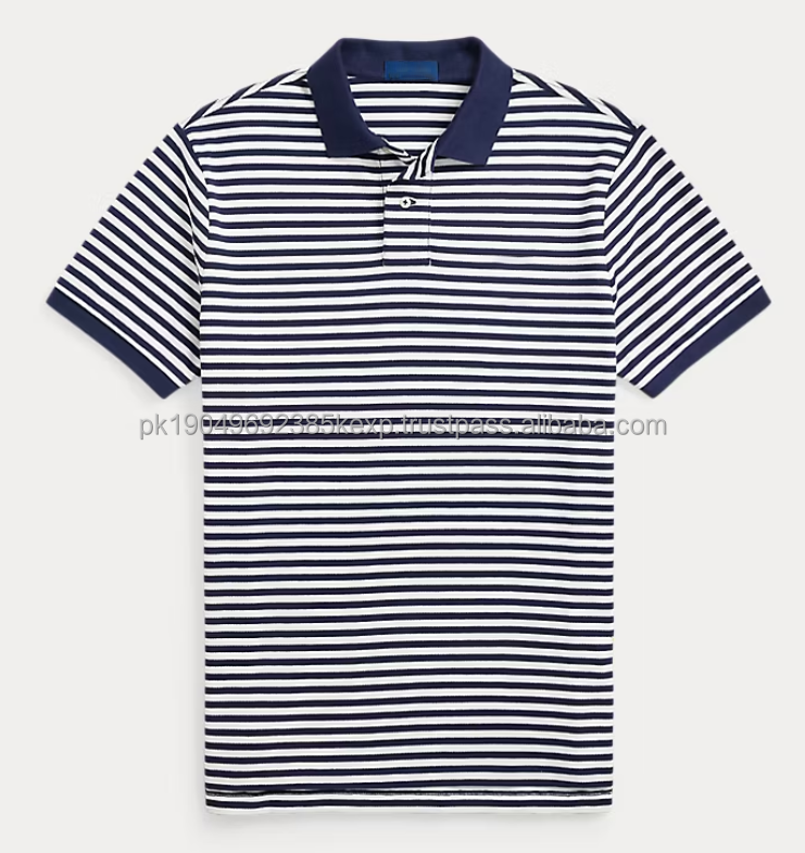 เสื้อโปโลลายทางแขนสั้นผ้าฝ้าย100% แบบคลาสสิกผ้าถักระบายอากาศได้ดีปักสีทึบสูง