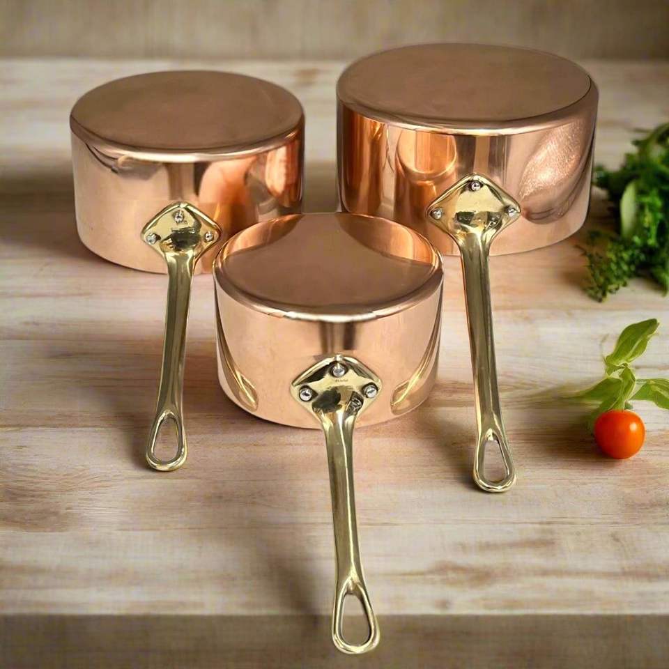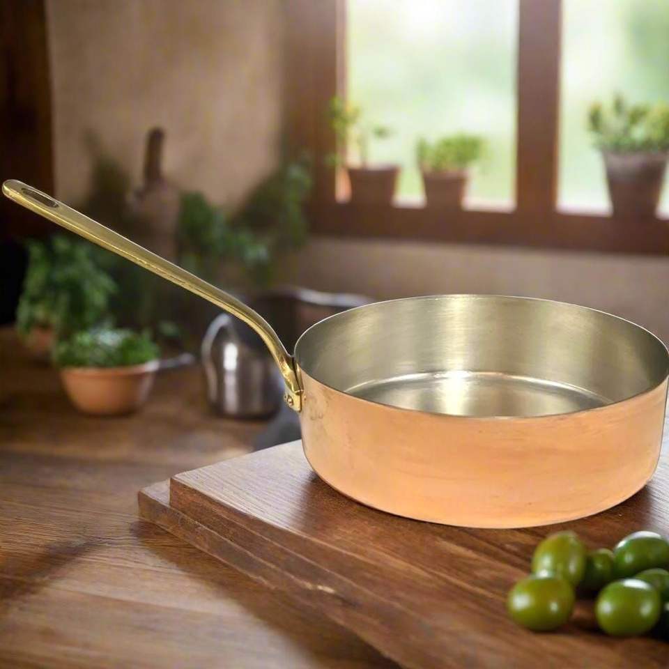 กระทะทองแดงตีลายแบบคลาสสิกพร้อมด้ามจับทองเหลือง กระทะทำมือสำหรับการทำอาหารระดับมืออาชีพและการจัดแสดงในครัว