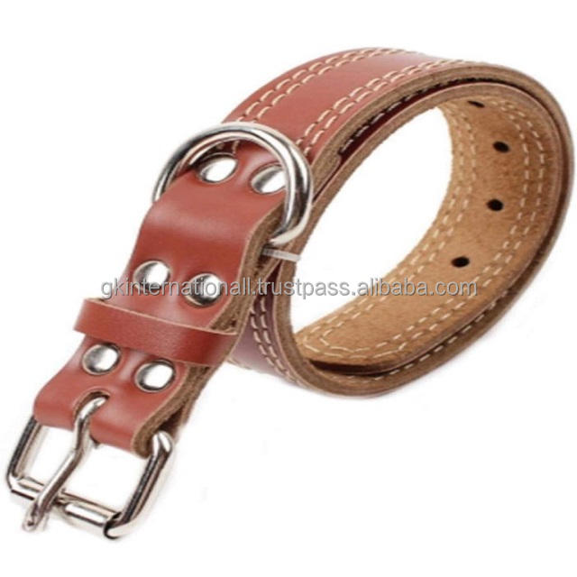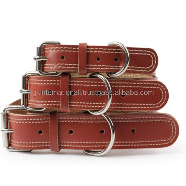 ปลอกคอสุนัขเย็บคู่หนังสีน้ำตาลพรีเมี่ยมสำหรับงานหนักแบบคลาสสิก