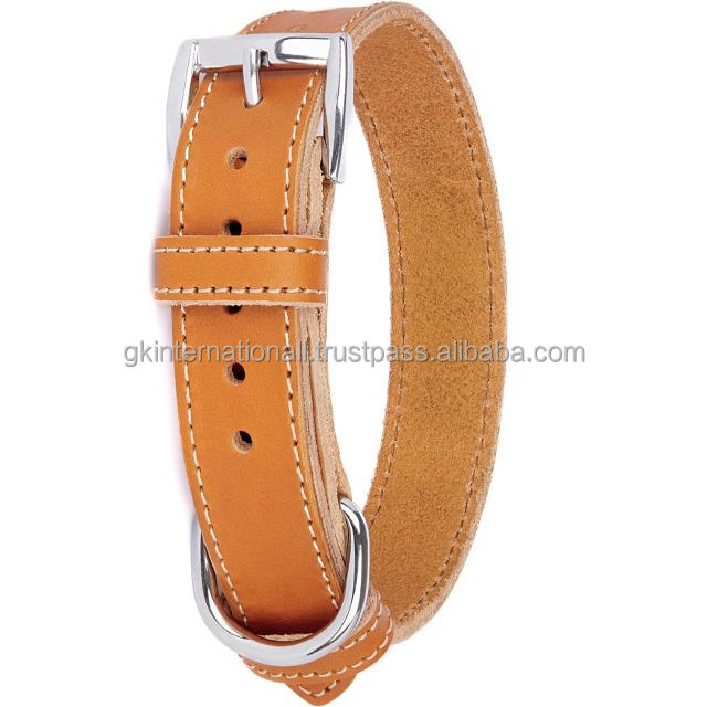 ปลอกคอสุนัขหนังสีน้ำตาลหนาสองชั้นทนทานพร้อมด้วยอุปกรณ์ทองเหลืองชุบนิกเกิลเย็บสีขาวทนทาน