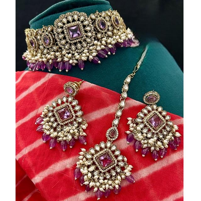 ชุดเครื่องประดับชุบทองคุณภาพสูงแบบคลาสสิก ประดับด้วยหินคุนดัน ดีไซน์แบบโชคเกอร์ พร้อมต่างหู สำหรับงานแต่งงาน คอลเลคชั่นสำหรับผู้หญิง
