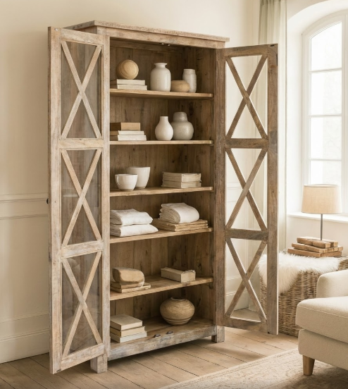 ตู้หนังสือแก้วแกะสลักลายไม้สไตล์อินเดียคลาสสิก หรือตู้เสื้อผ้าแบบโชว์สินค้าสไตล์ชนบทแบบทาสี