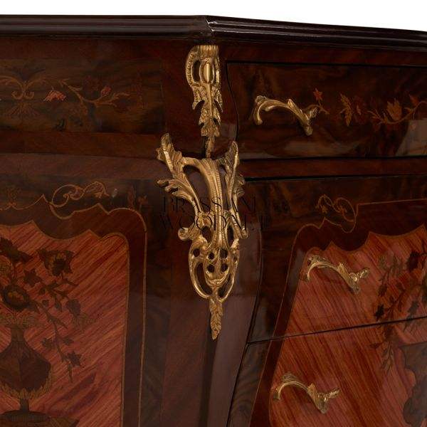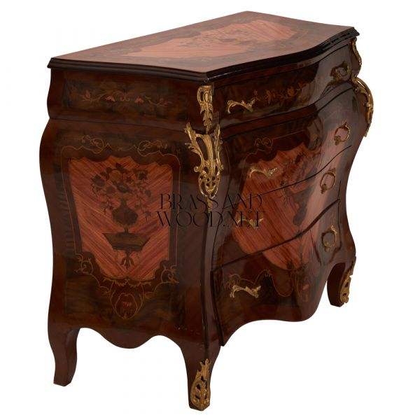 ตู้คอนโซลไม้ฝังลายคลาสสิก ดีไซน์โค้งมน พร้อมมือจับทองเหลืองตกแต่ง ตู้เก็บของหรูหราสง่างาม