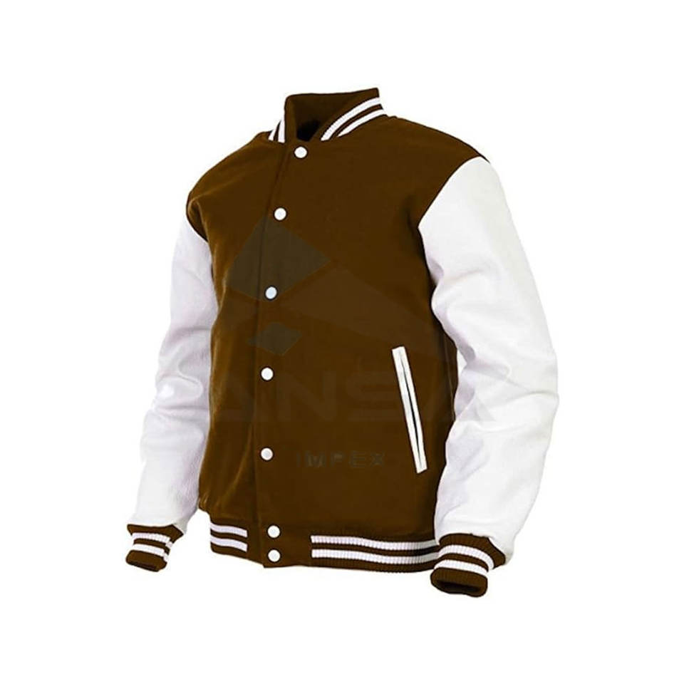 Classic Men College Varsity Jacket with Leather Sleeves and Wool Blend Body Adjustable Fit Warm Lightweight Construction Brown