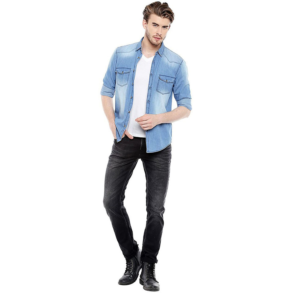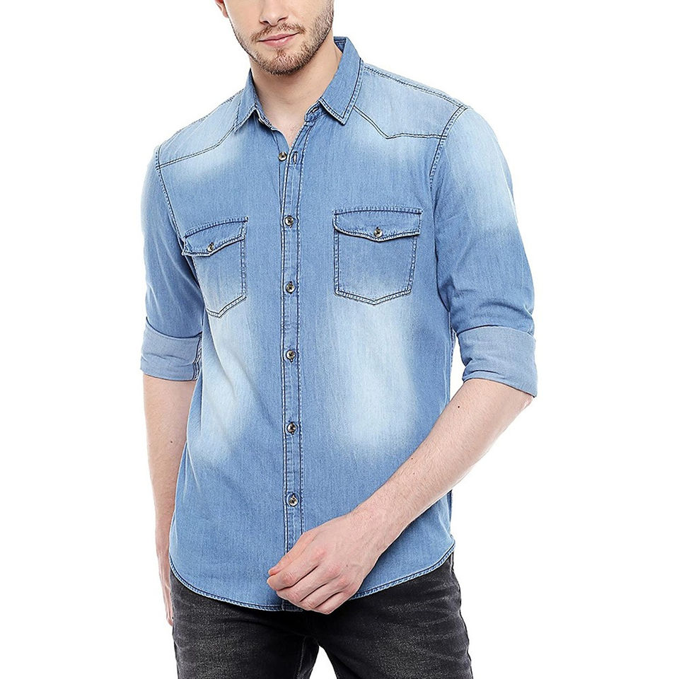 Classic Men's Denim Shirt Turn-down Collar Single Button Closure Anti-Wrinkle Breathable 100% Cotton Regular Fit Soft Washed