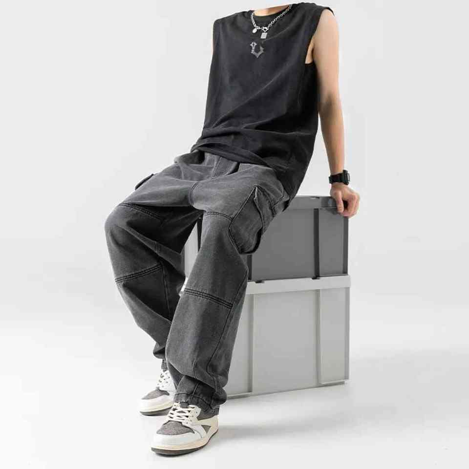 กางเกงยีนส์ทรงหลวมสำหรับผู้ชายแบบคลาสสิกกางเกงยีนส์ทรงหลวมมีกระเป๋าที่หลากหลายสไตล์ลำลองแนวสตรีทสวมใส่สบายแฟชั่นฮิปฮอป
