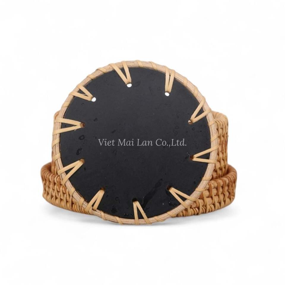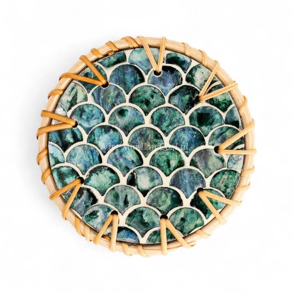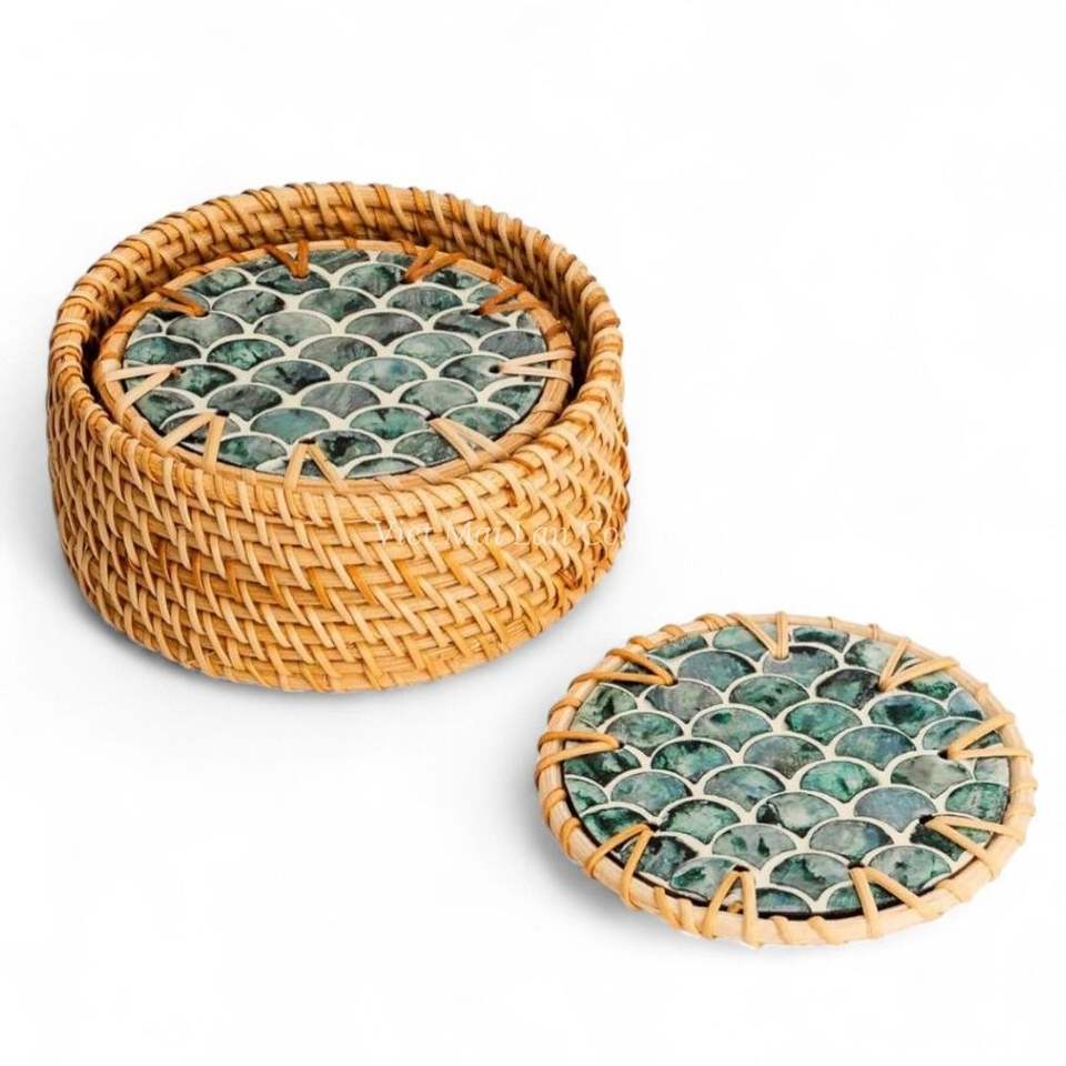 ชุดจานรองแก้วมุกคลาสสิก 6 ชิ้น พร้อมขอบหวายถักและกล่องหวายสำหรับตกแต่งภายใน