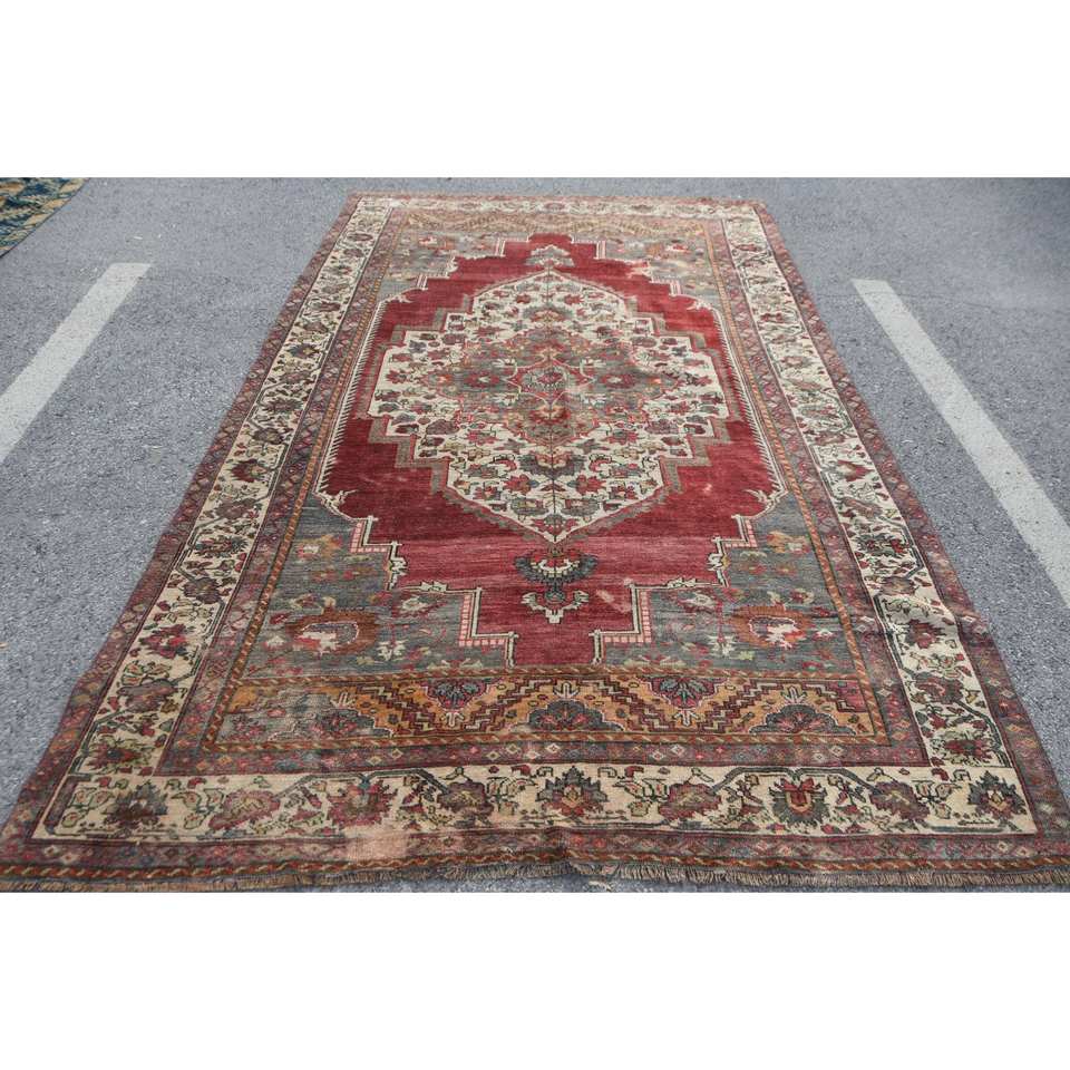 พรมขนสัตว์สีเบจสีแดงคลาสสิกขนาด5.9x10ฟุตงานปะติดสี่เหลี่ยมผืนผ้าพื้นที่ขนาดใหญ่สไตล์แอบสแตรกต์รูปห้องโถงสำหรับวัยรุ่น