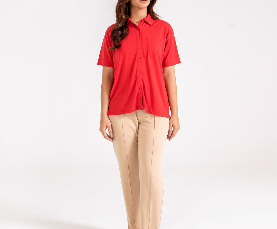 เสื้อเชิ้ตแขนสั้นสีแดงคลาสสิกแบบติดกระดุม เสื้อยืดผู้หญิง เสื้อแฟชั่นสั่งทำพิเศษ เสื้อผ้าคุณภาพสูง ทรงหลวม สวมใส่สบาย เหมาะสำหรับฤดูร้อน