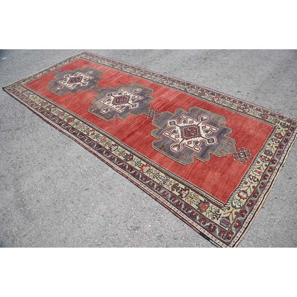 พรมขนแกะสีเทาแดงแบบคลาสสิกแนววินเทจสไตล์ตุรกี4.9 x 11.2ft พื้นที่ขนาดใหญ่เย็บปะติดปะต่อกันด้วยสไตล์โบฮีเมียนสี่เหลี่ยมผืนผ้า