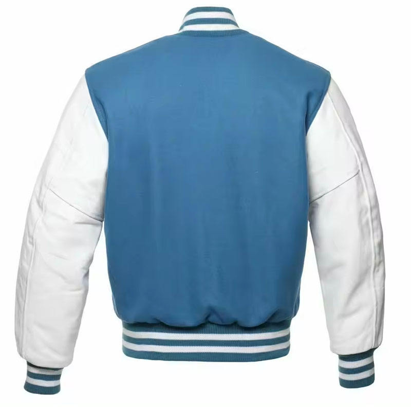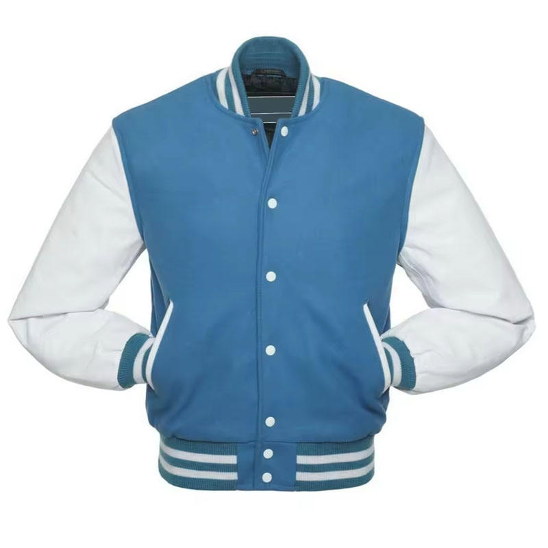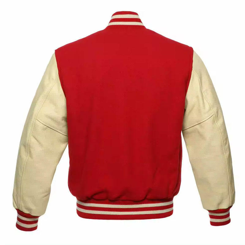 เสื้อแจ็กเก็ตเบสบอลแขนยาวสีครีมหนัง PU สีขาวผ้าขนสัตว์สีแดงคลาสสิกสำหรับผู้ชายขายส่ง