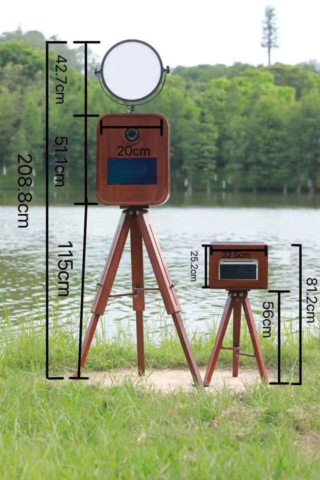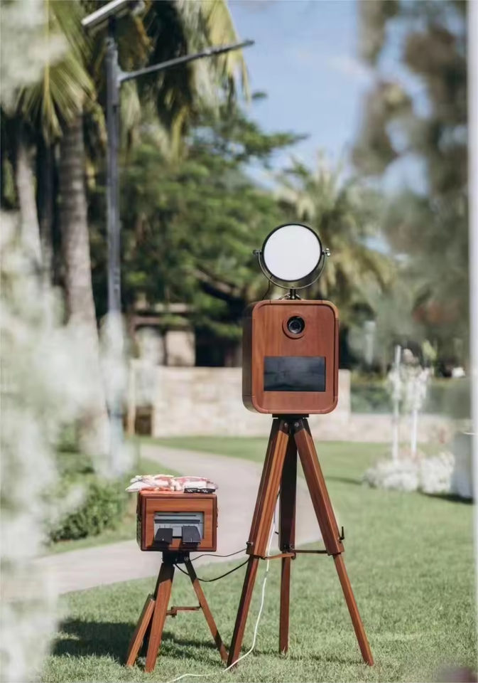 บูธถ่ายภาพไม้แบบย้อนยุคคลาสสิกสำหรับงานแต่งงานกล้องแบบโต้ตอบกล้อง DSLR กระจก iPad ขาตั้งเครื่องพิมพ์แบบวินเทจ