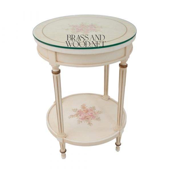 โต๊ะข้างทรงกลมคลาสสิกทำจากไม้ พร้อมท็อปกระจก ชั้นวางด้านล่าง ลายดอกไม้เพ้นท์มือ ดีไซน์สไตล์ฝรั่งเศสสุดหรู
