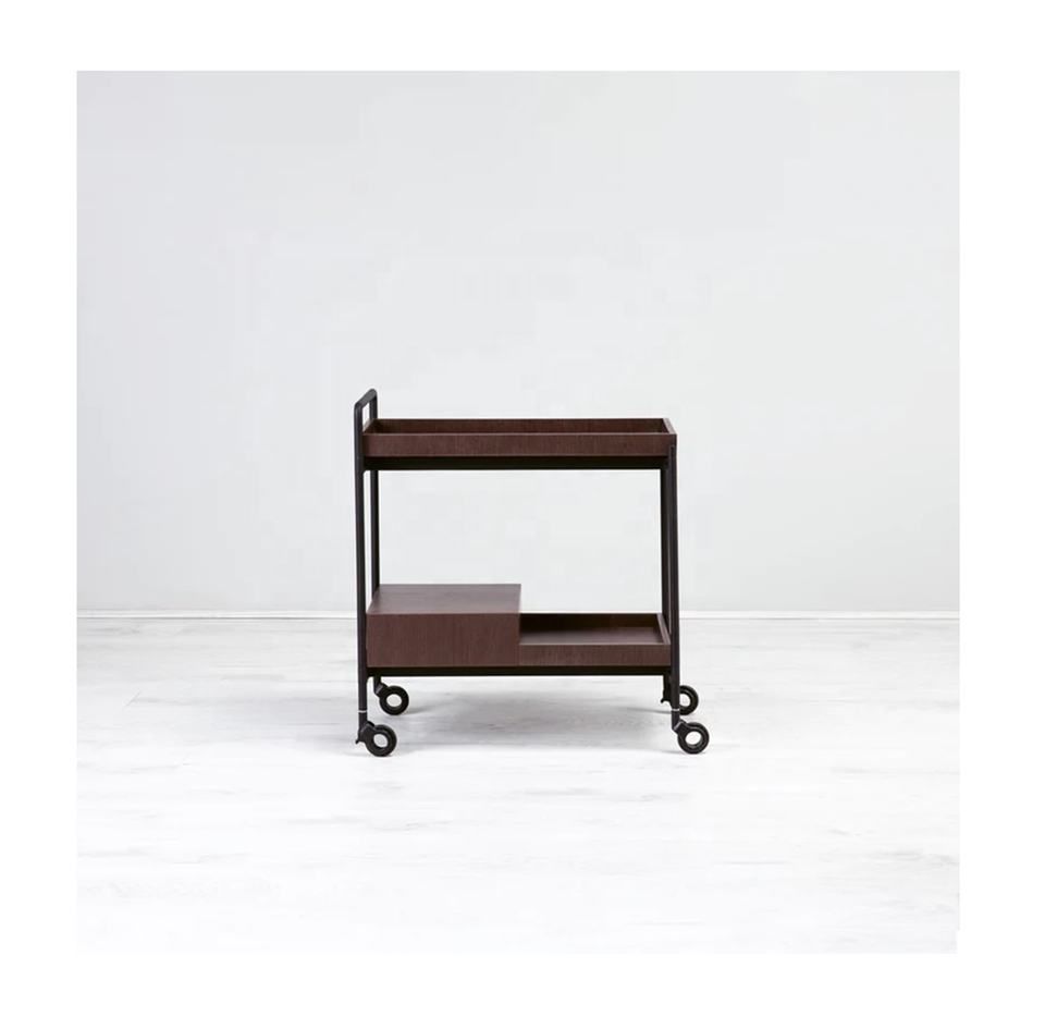 รถเข็นร่มเงาสไตล์คลาสสิกเสิร์ฟรถเข็นบาร์ 2 ระดับที่ไม่ซ้ําใคร 2 ชั้นล้อเรียบผู้ผลิตรถเข็นเสิร์ฟโลหะขายส่ง