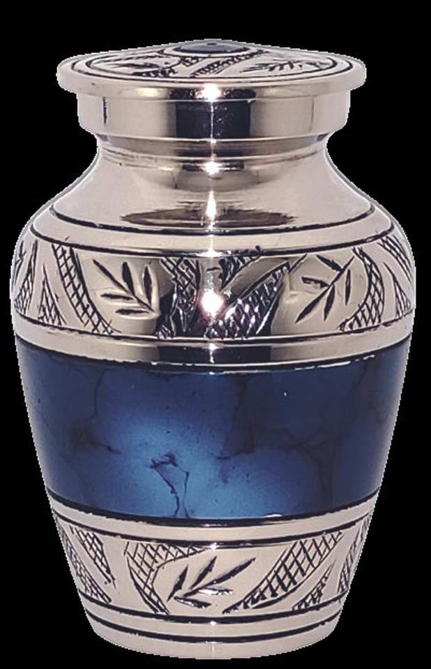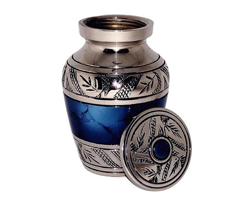 ของที่ระลึกการฌาปนกิจศพขนาดเล็กแบบคลาสสิกสำหรับเถ้ามนุษย์พร้อมกล่องกำมะหยี่ขนาด2.6นิ้วดีไซน์ไฟสีน้ำเงินทำจากทองเหลือง