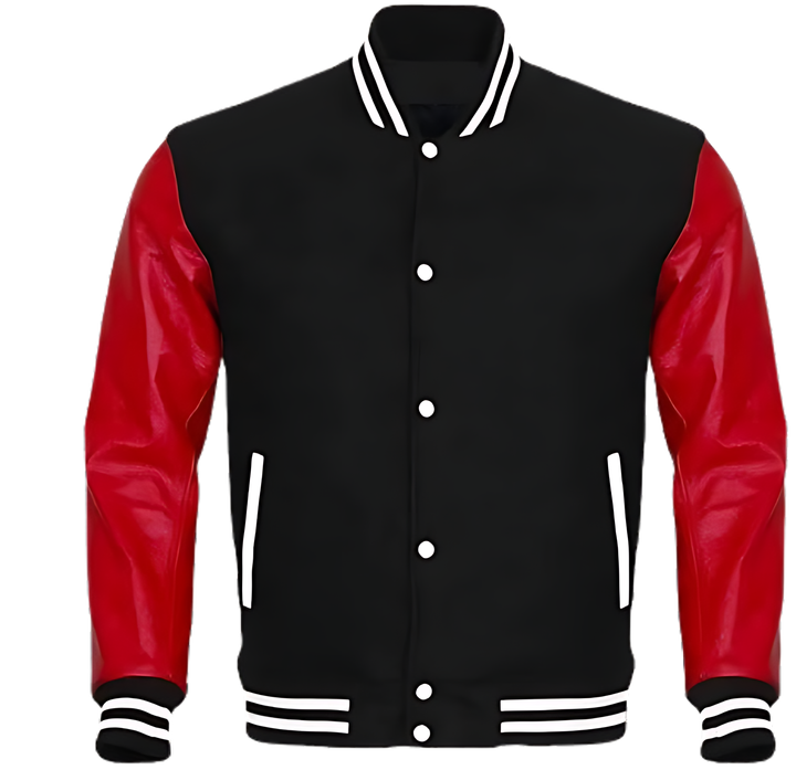 แจ็คเก็ตสไตล์วาร์ซิตี้คลาสสิก ติดกระดุมแป๊ก ชายเสื้อแบบริบ ผลิตตามแบบ OEM ตัวเสื้อทำจากผ้าขนสัตว์ แขนเสื้อทำจากหนังเทียม ทรงคลาสสิกแบบ High Street