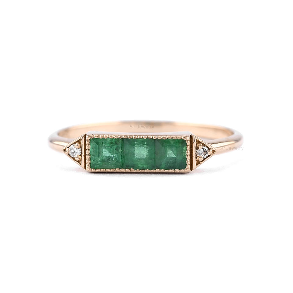 แหวนหมั้นทองแข็ง14K สไตล์คลาสสิกมรกตสามสี่เหลี่ยมเล็กๆธรรมชาติกับเพชรสามเหลี่ยมสำหรับงานแต่งงาน