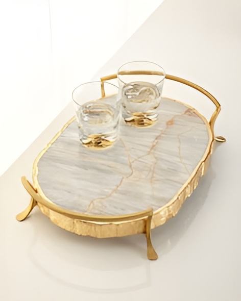 ถาดเสิร์ฟหินอ่อนสไตล์คลาสสิกด้ามจับโลหะแบบยั่งยืนจานจานครัวบ้านงานปาร์ตี้ออกแบบได้ตามต้องการรูปทรง