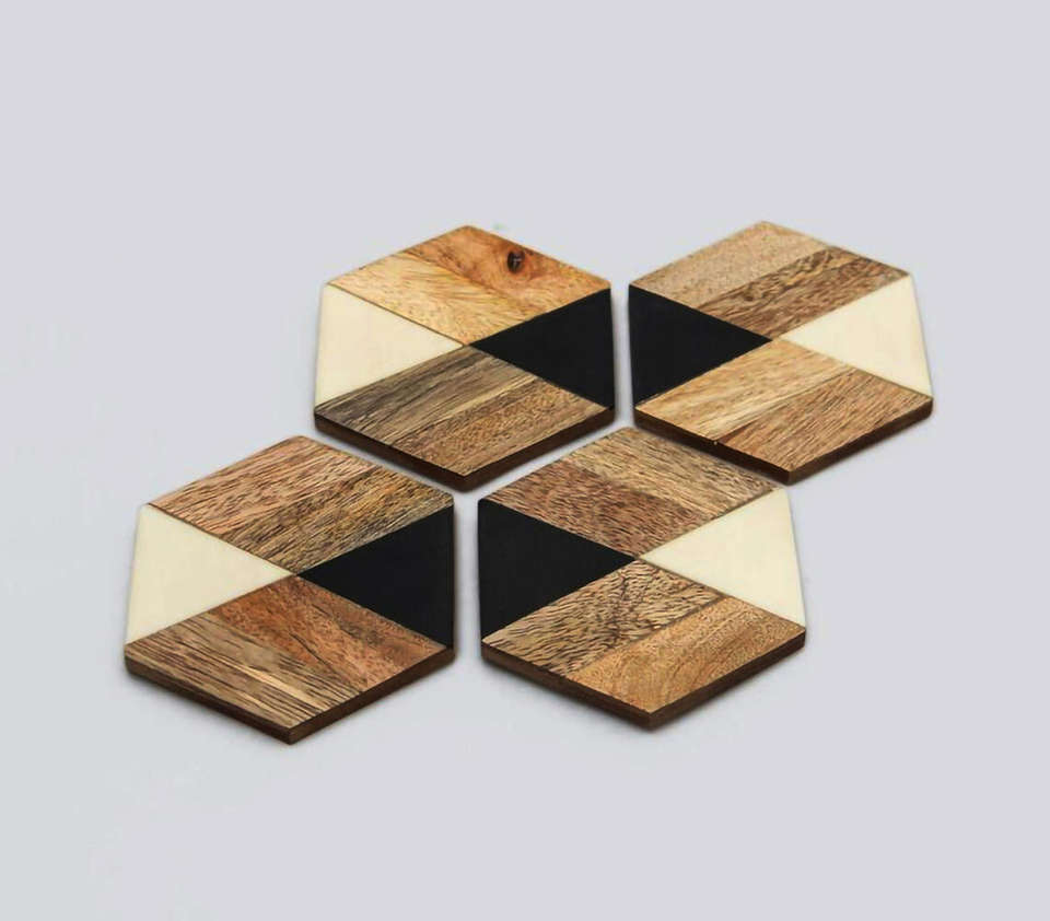 ที่รองแก้วไม้วอลนัททรงหกเหลี่ยมแบบฝังเรซิน4ชิ้นสไตล์คลาสสิก