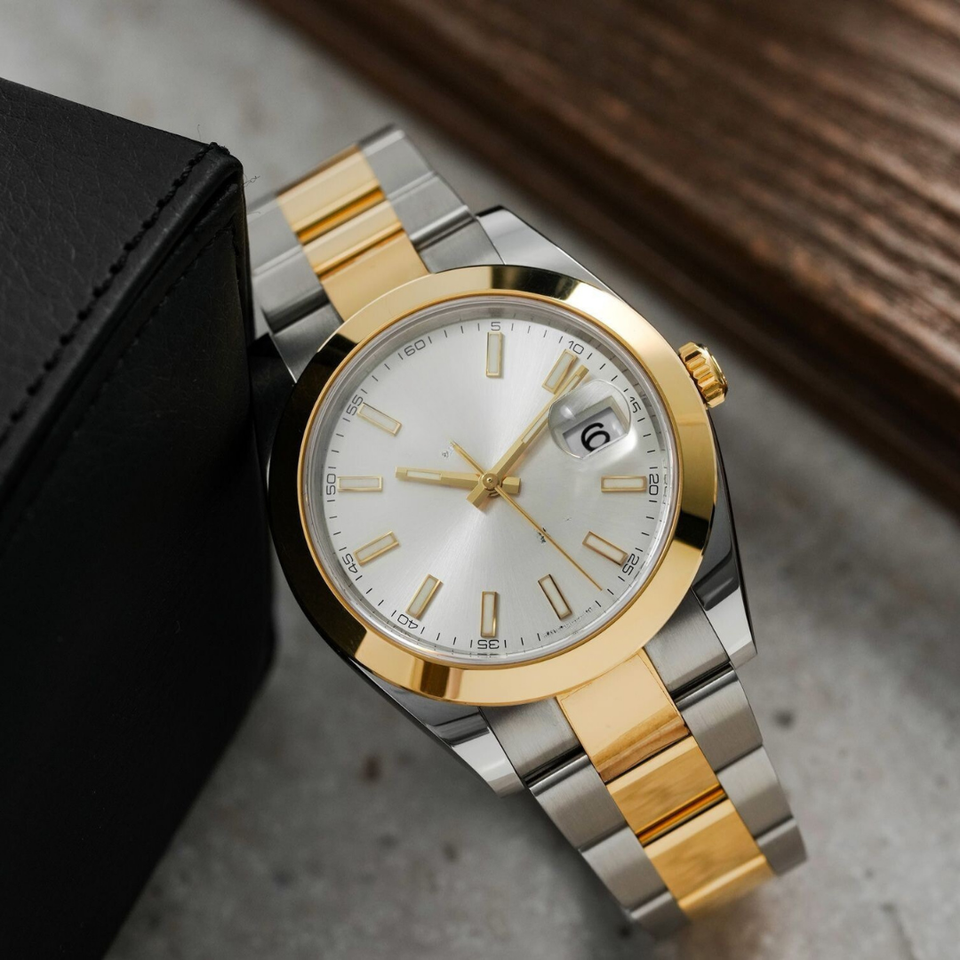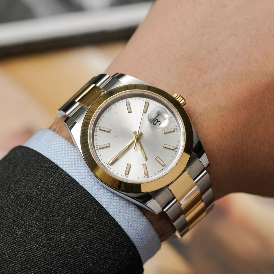 นาฬิกาสแตนเลสสตีลสองสีสุดหรู พร้อมหน้าปัดแสดงวันที่ ดีไซน์คลาสสิก ตัวบอกเวลาเรืองแสง สายข้อมือขัดเงา คุณภาพสูง ขายส่ง