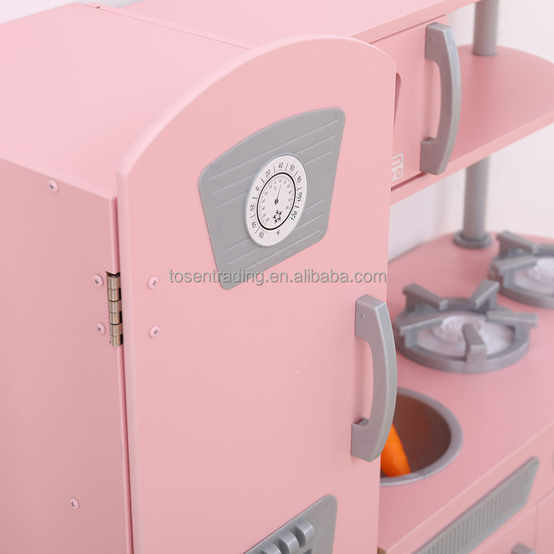 ครัวไม้จำลองสไตล์วินเทจสำหรับเด็กเล่นในบ้าน พร้อมเครื่องทำน้ำแข็ง โทรศัพท์ ก๊อกน้ำ อ่างล้างจาน เตา และเตาอบ สีชมพู