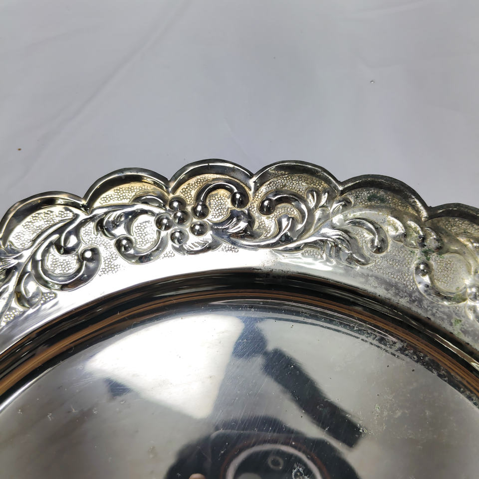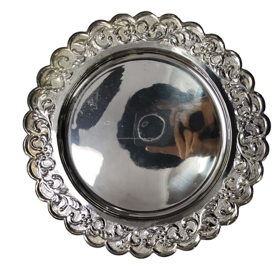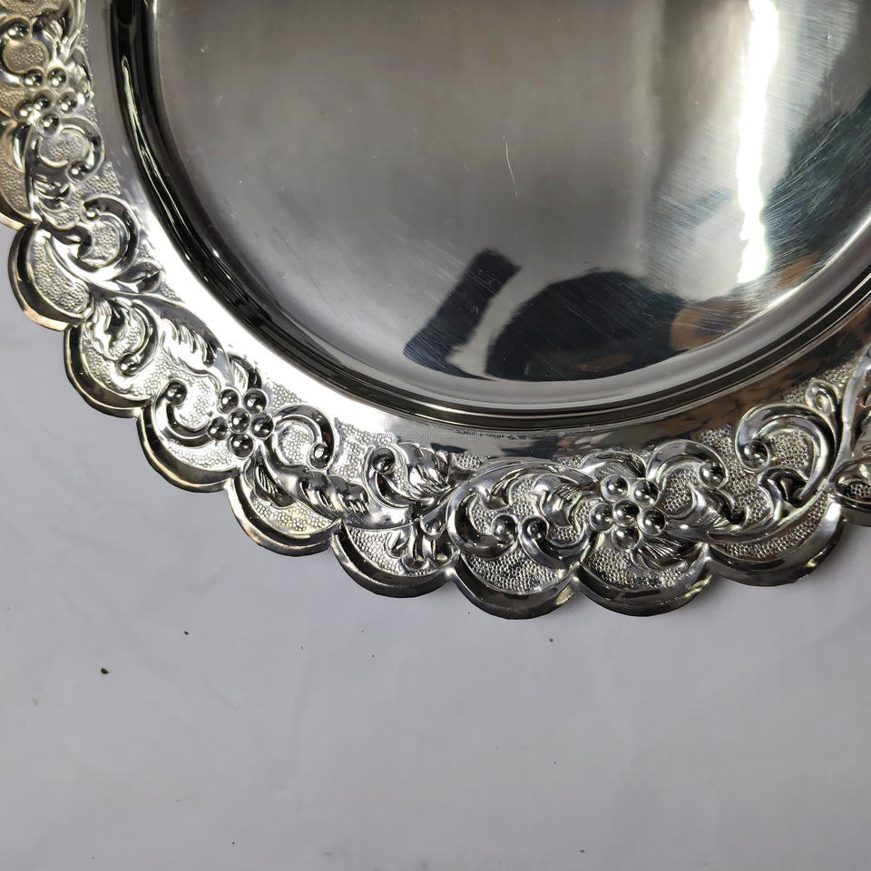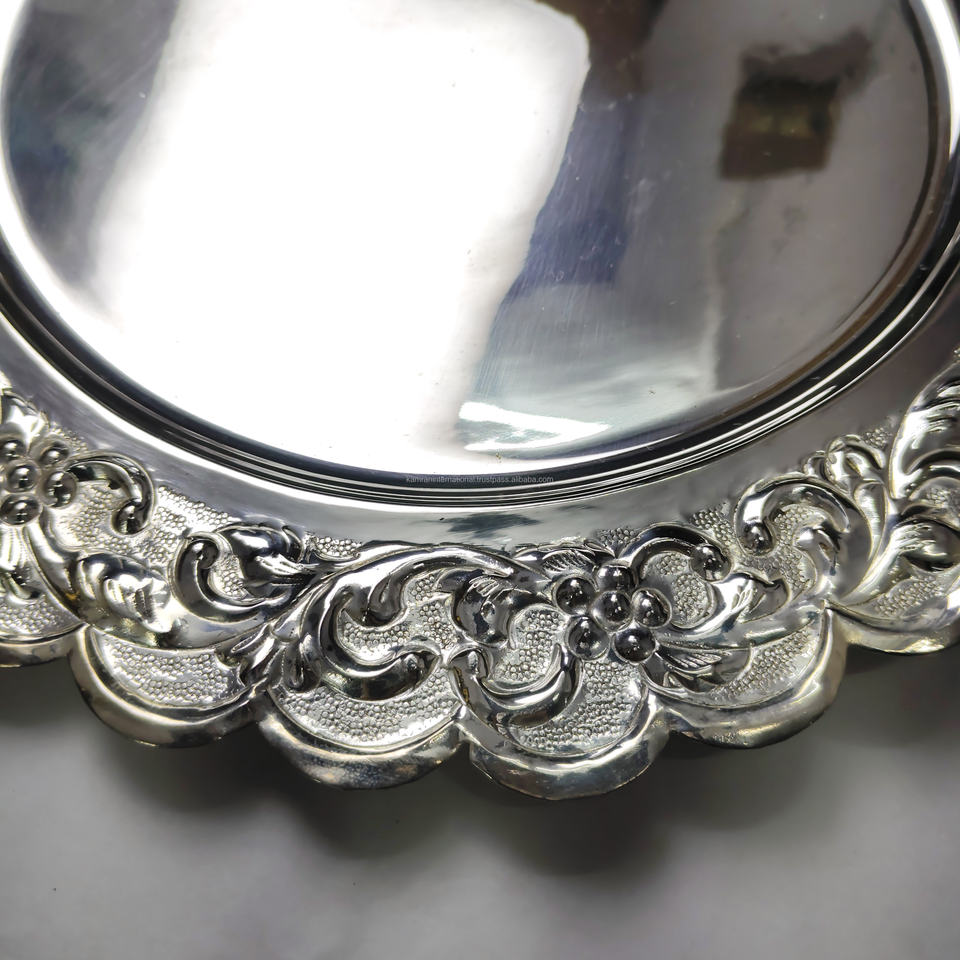 ถาดเสิร์ฟทรงกลมชุบเงินสไตล์วินเทจคลาสสิก พร้อมขอบลายดอกไม้แบบนูน ตกแต่งสำหรับวางเค้กงานแต่งงาน
