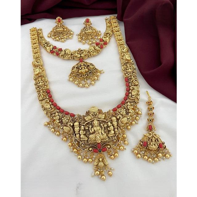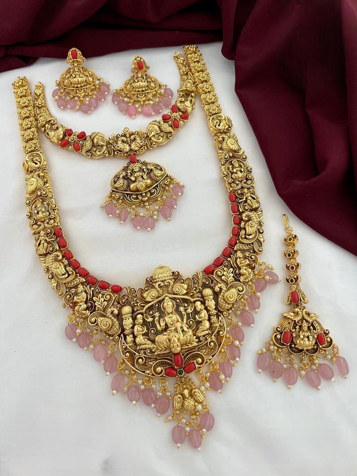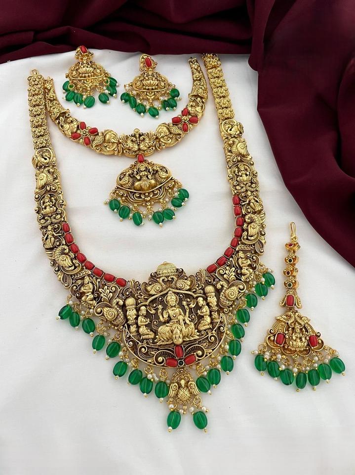 Classic Vintage Temple Jewelry Set Gold Lakshmi Bridal Necklace and Earrings for Wedding Party Handmade Brass Grand Jewelry