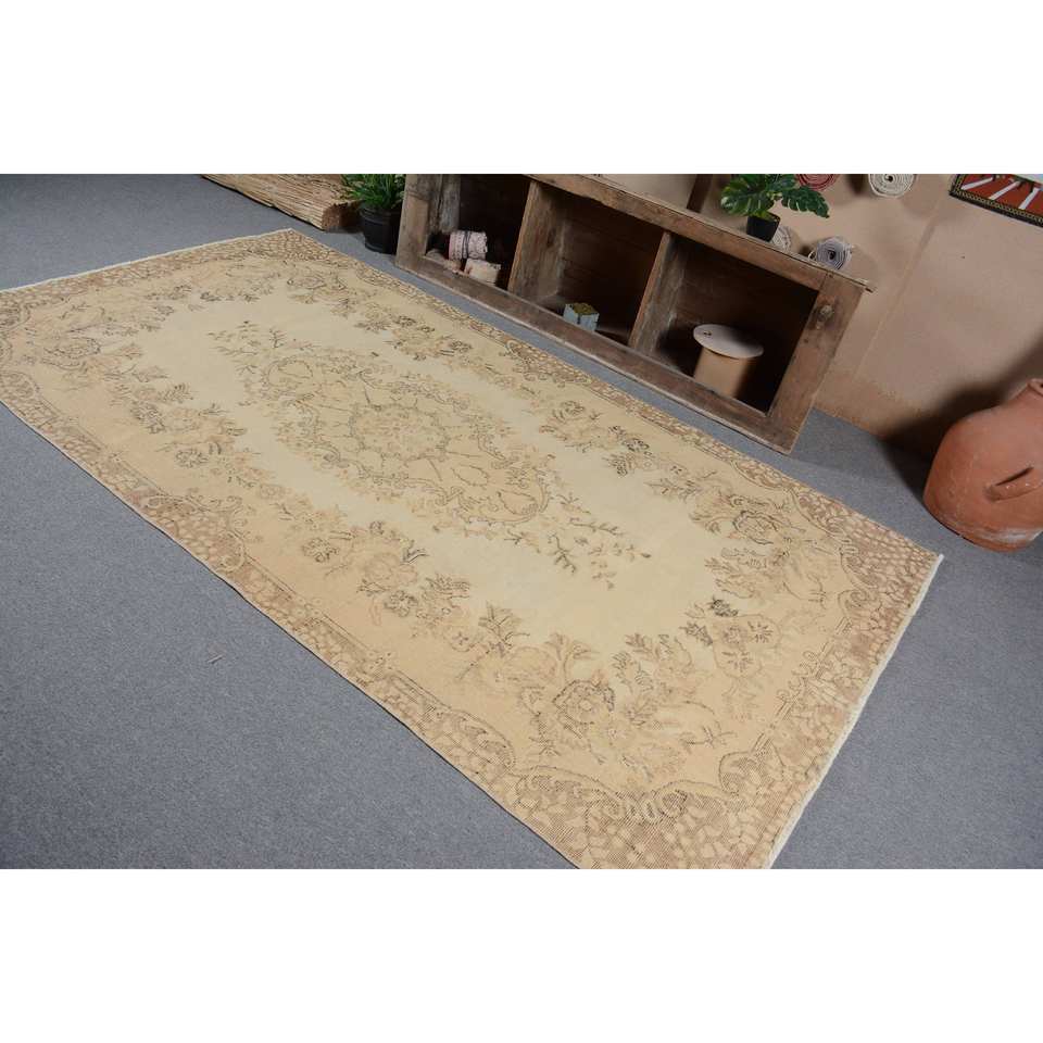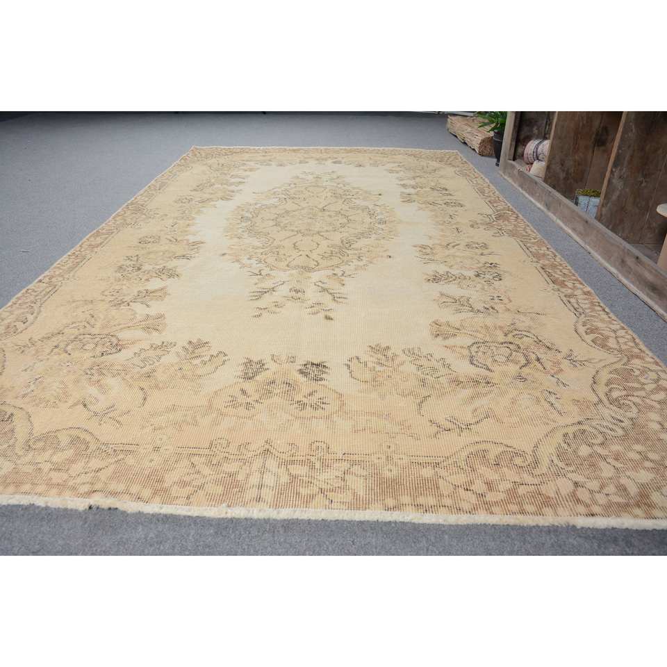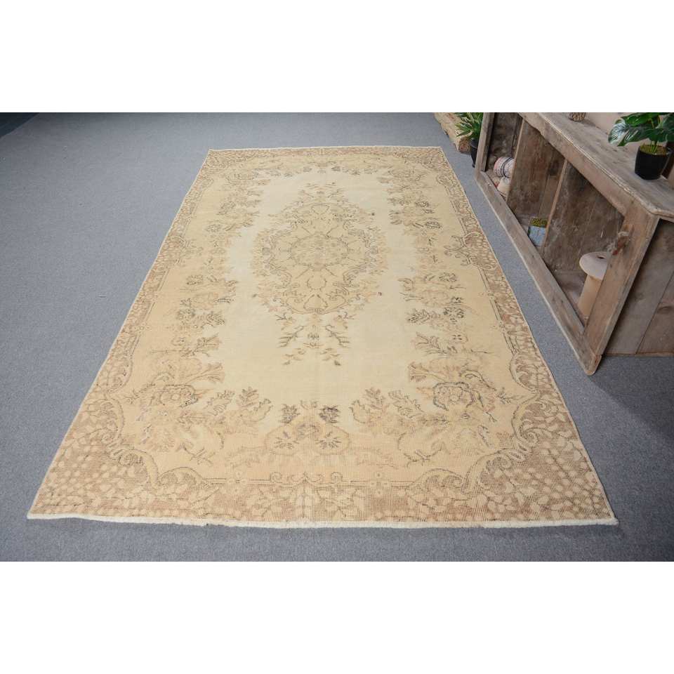 พรมตุรกีโบราณคลาสสิกขนาด5.3X9.5ฟุตงานปะทำด้วยมือสีเบจผ้าไหมขนสัตว์ไม้ไผ่พร้อมยางรองสำหรับวัยรุ่น