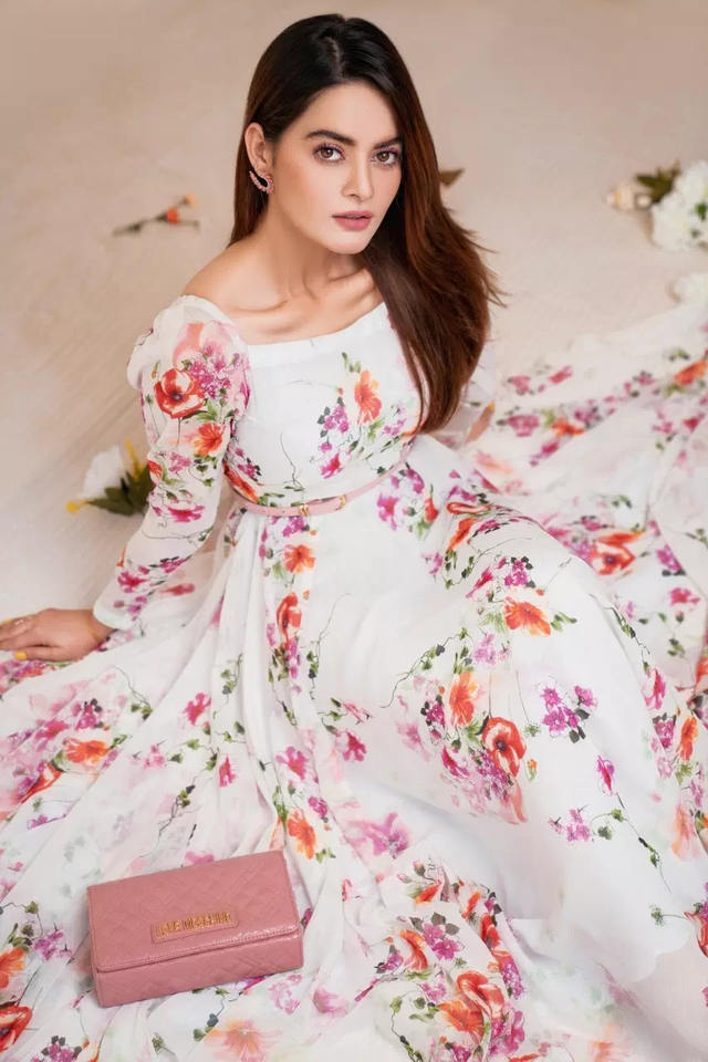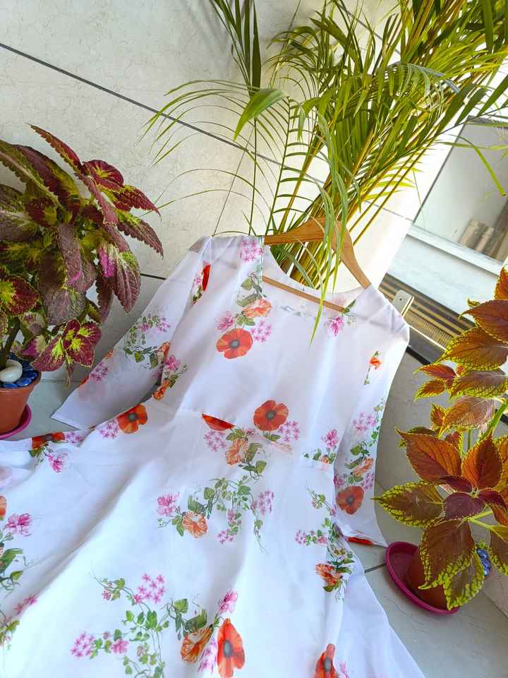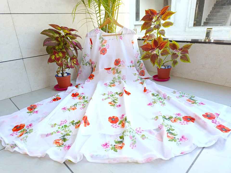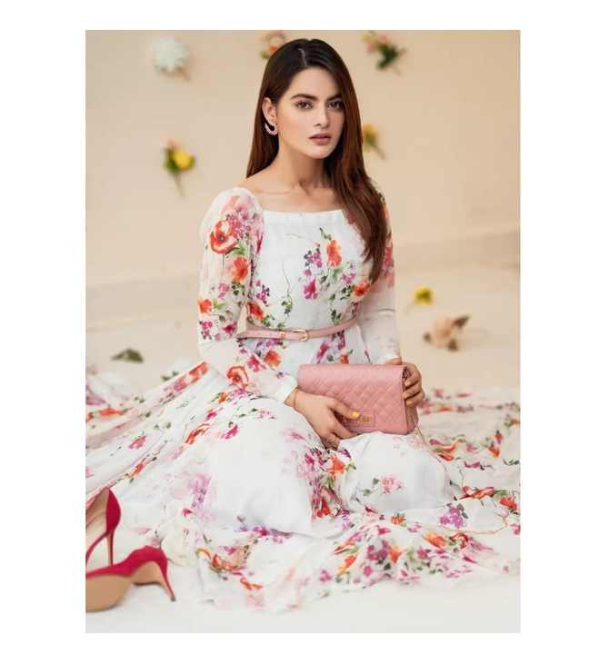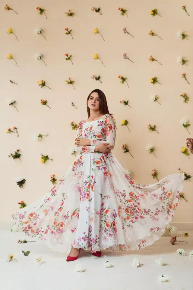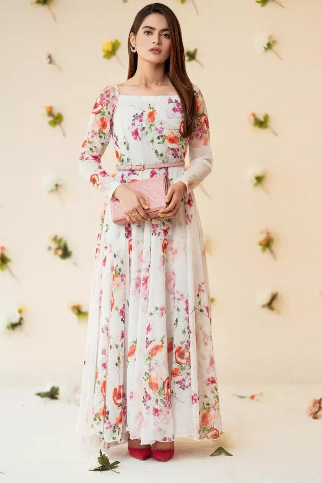 ชุดเดรสลายดอกไม้สีขาวคลาสสิกจากผ้าจอร์เจตท์เนื้อนุ่มพิมพ์ลายดอกไม้ดิจิทัล ทรงเข้ารูปและบานออกช่วงล่าง ชุดเดรสยาวสำหรับผู้หญิง