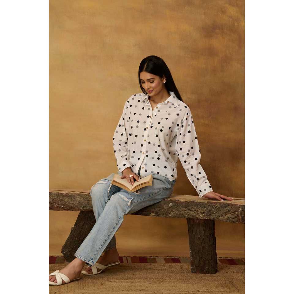 เสื้อเชิ้ตผู้หญิงผ้าลินินลายจุดสีขาวคลาสสิก พิมพ์ลายด้วยมือ คอปกโบว์วินเทจ ติดกระดุม ทรงเข้ารูป ใส่ได้ทั้งฤดูใบไม้ร่วง ฤดูใบไม้ผลิ และฤดูร้อน