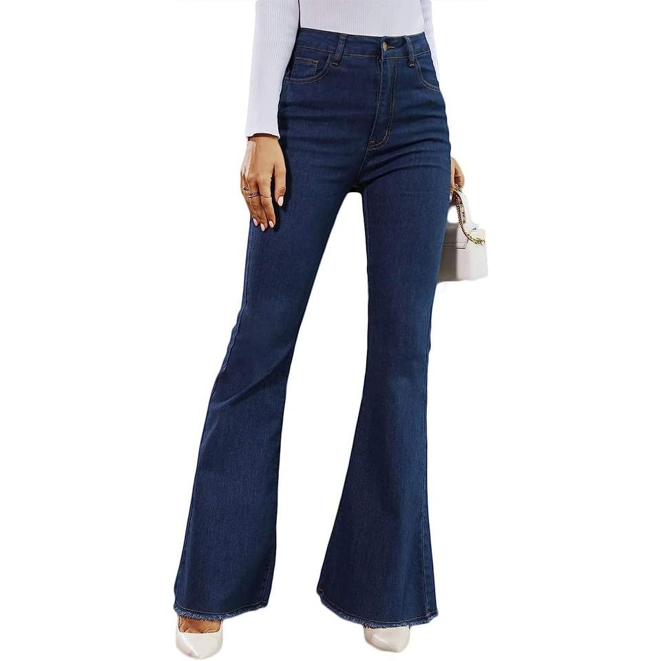 กางเกงยีนส์ขาบานเอวสูงสำหรับวัยรุ่นผู้หญิงกางเกงผ้าเดนิมทรงเอวสูงระบายอากาศได้ดีคลาสสิก